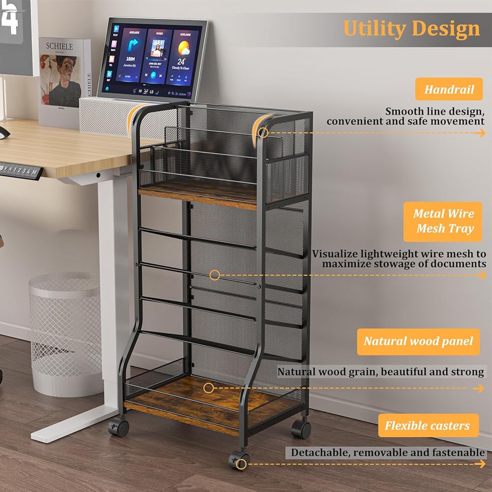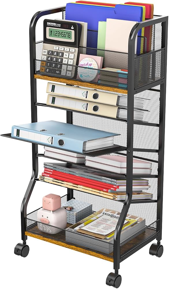 عربة ملفات متدحرجة ذات 6 طبقات، تصميم من الخشب والشبك مع عجلات قابلة للفصل، صواني قابلة للإزالة، عربة مكتب متدحرجة، منظمة منزلية، مكتب منظم للورق بجانب رف الكتب المحمول