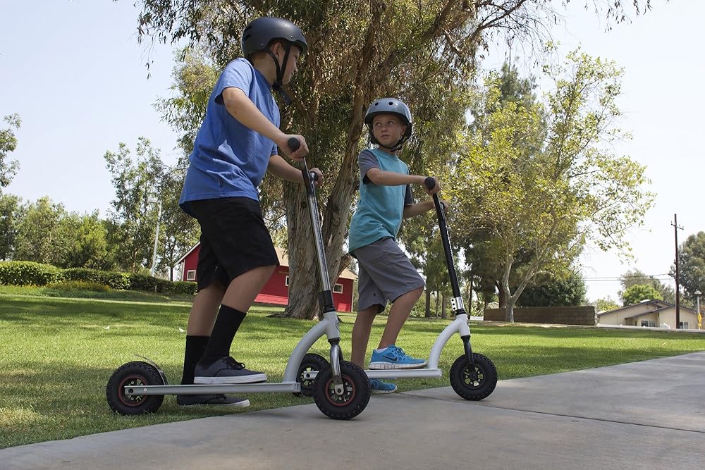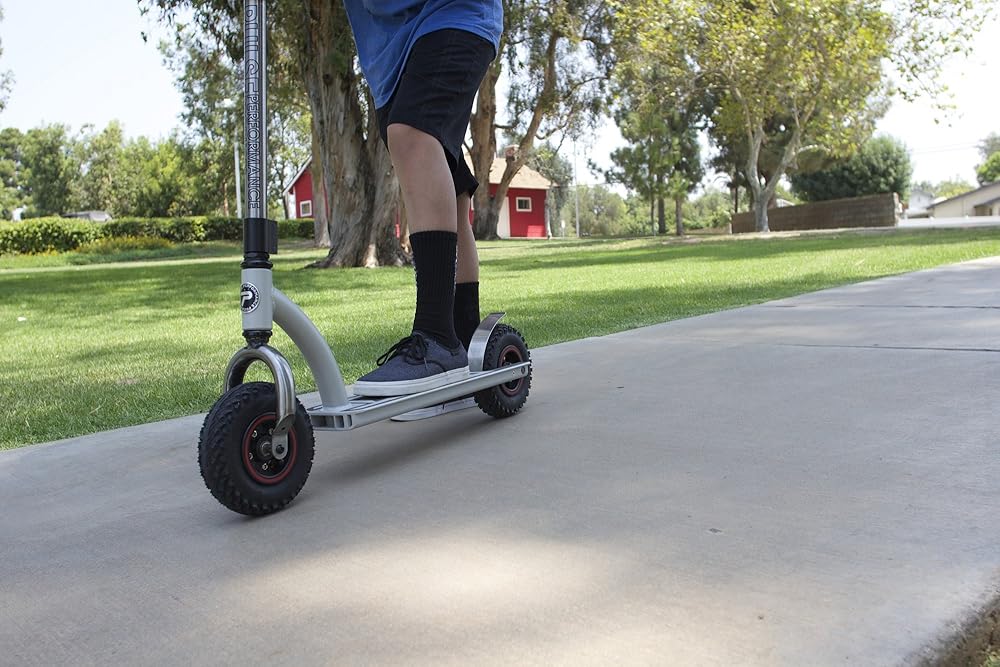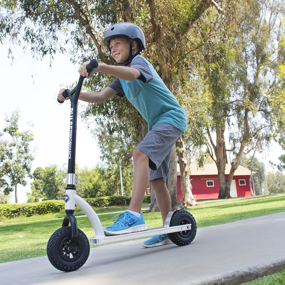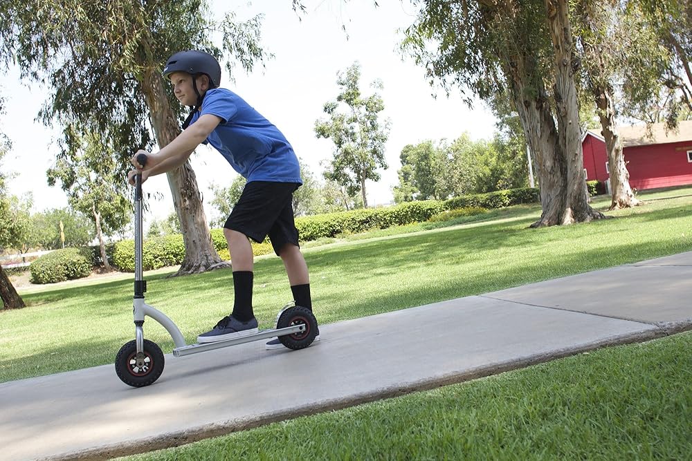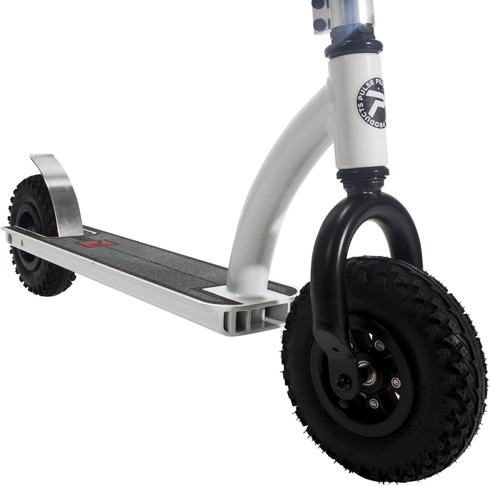 The Pulse Performance DX1 All-Terrain Scooter is designed for scooter riders of all ages, abilities and levels. The heavy-duty construction and oversized 8” knobby, air filled tires handle the impacts of riding on or off-road. The grip tape deck surface of the Pulse Performance DX1 All-Terrain Scooter holds the rider's feet safely in place while riding on any surface. Oversized aluminum deck allows for multiple riding positions and easy control at all times.