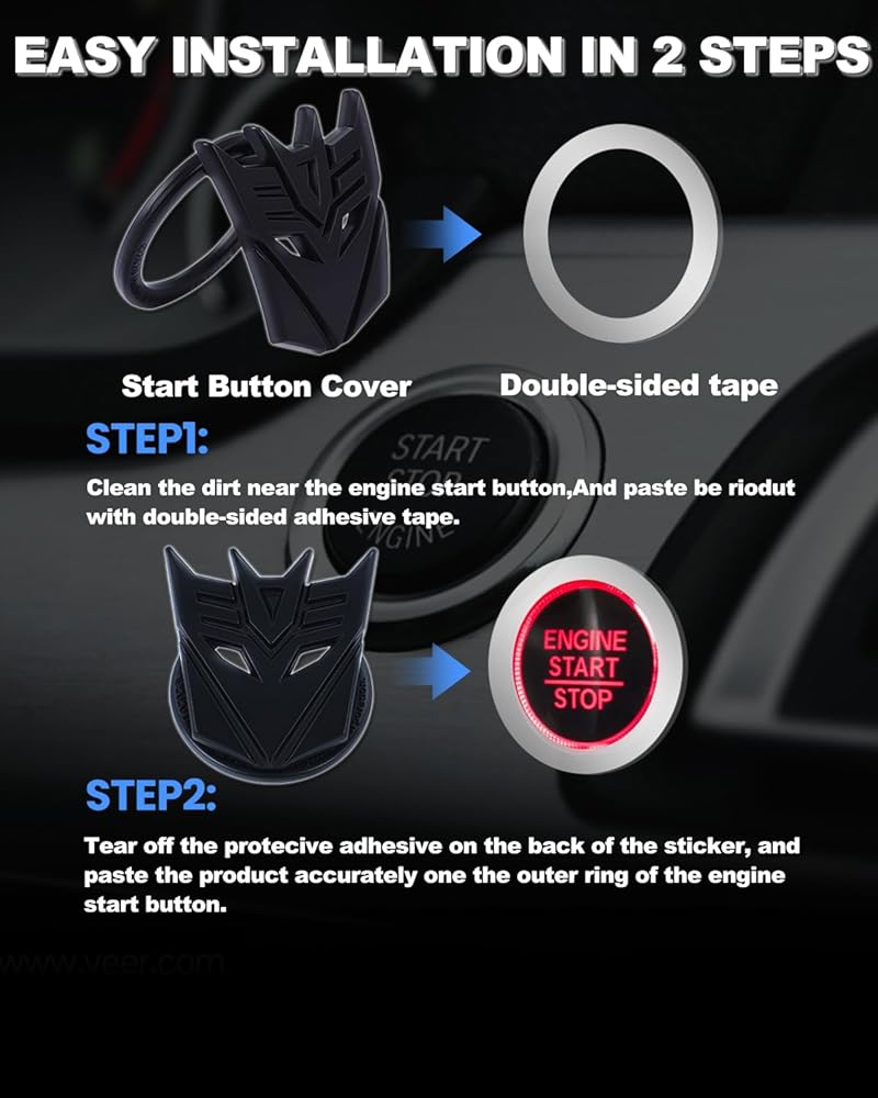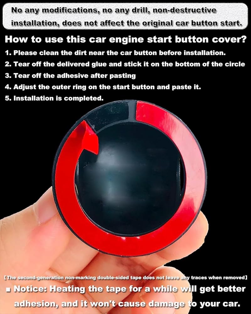 • 🚓【سهلة التركيب】: أولاً، قم بتنظيف زر سيارتك قبل التثبيت. ثم قم بلصق الشريط ذي الوجهين أسفل غطاء البداية. ثم قم بتمزيق ورق التغليف بشريط لاصق على الوجهين وألصق غطاء البداية على جهاز الإشعال.