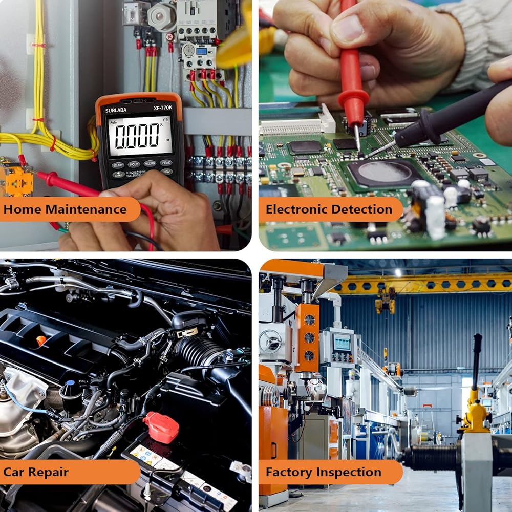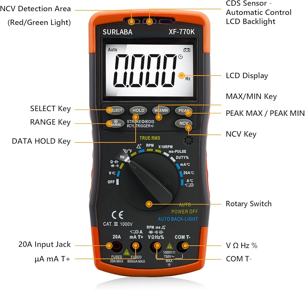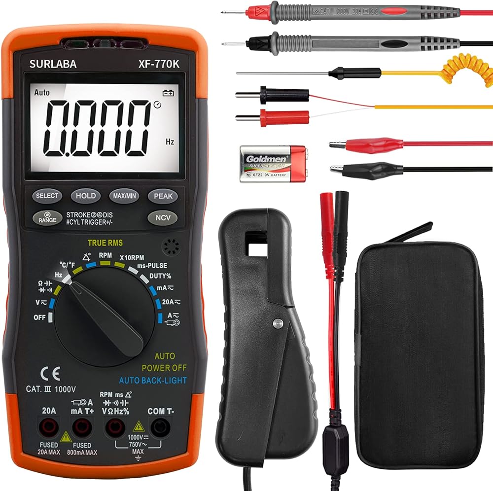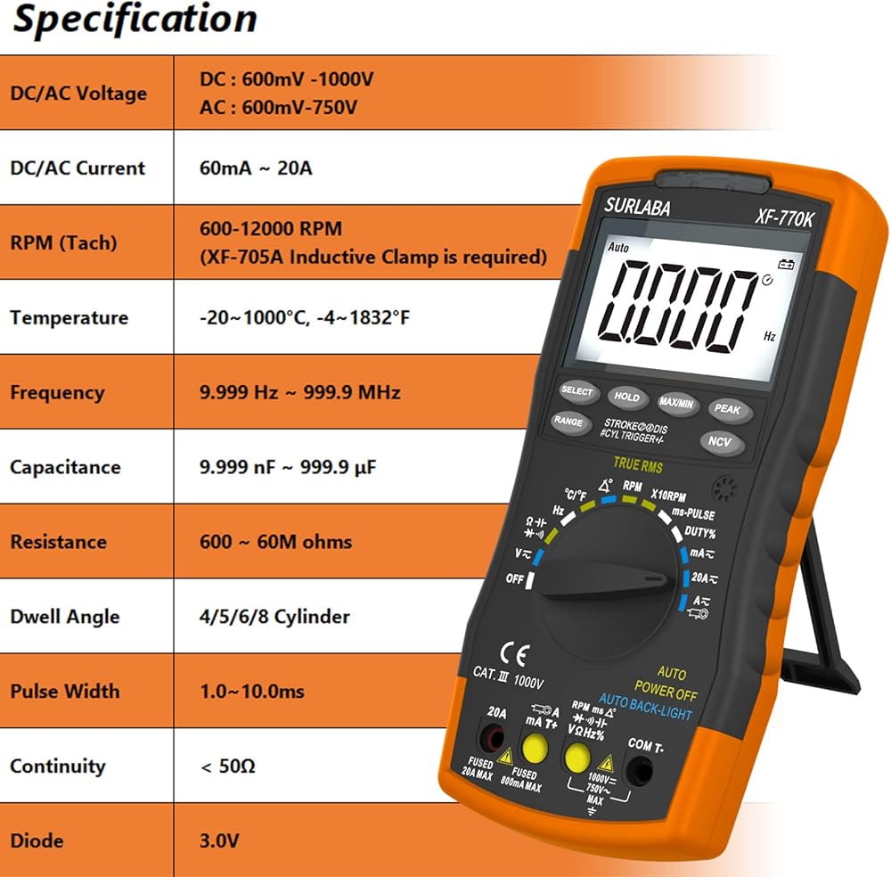 【Versatile Multi-function Automotive Multimeter】SURLABA XF-770K digital multimeter can accurately measure AC/DC voltage (DC: 600mV-1000V; AC: 600mV-750V), AC/DC current (60mA~20A), resistance (600Ω~60MΩ), capacitance (9.999nF ~ 99.99mF), Dwell Angle 4/5/6/8 Cylinder, pulse width (1.0~10.0ms), frequency (9.999Hz ~9.999MHz), temperature (-20-1000℃), continuity, test diodes. This smart multi tester can diagnose automotive, industrial and household electrical issue.