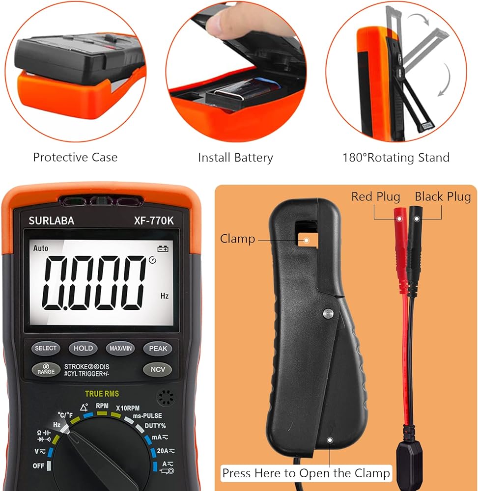 【RPM Measuring Tool Included】A signal pick up inductive clamp (XF-705A) is included, it can perfectly work with XF-770K multimeter or oscillograph for tach RPM measurement. This gasoline tachometer measurement range is 600~12000 RPM, suitable for spark plug ignition gasoline engine.