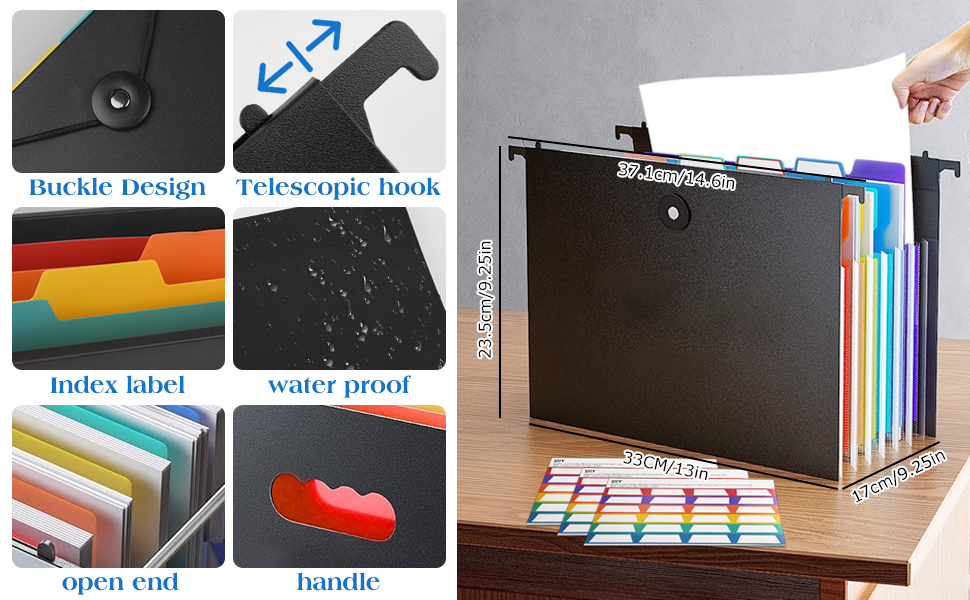 وظائف قابلة للتكيف لمختلف السيناريوهات: يلبي مجلد التمديد الخاص بنا متطلبات التخزين المتنوعة، ويوفر أوضاع الاستخدام المزدوج. أولاً، يعمل بسلاسة كمجلد معلق، مما يكمل بشكل مثالي خزائن الملفات لإعدادات المنزل أو المكتب. ثانيًا، يتحول إلى مجلد قابل للطي، مما يعمل على تحسين قابلية النقل والتخزين السهل للاستخدام اليومي. تضمن هذه القدرة على التكيف التطبيق العملي عبر مجموعة من المواقف.
