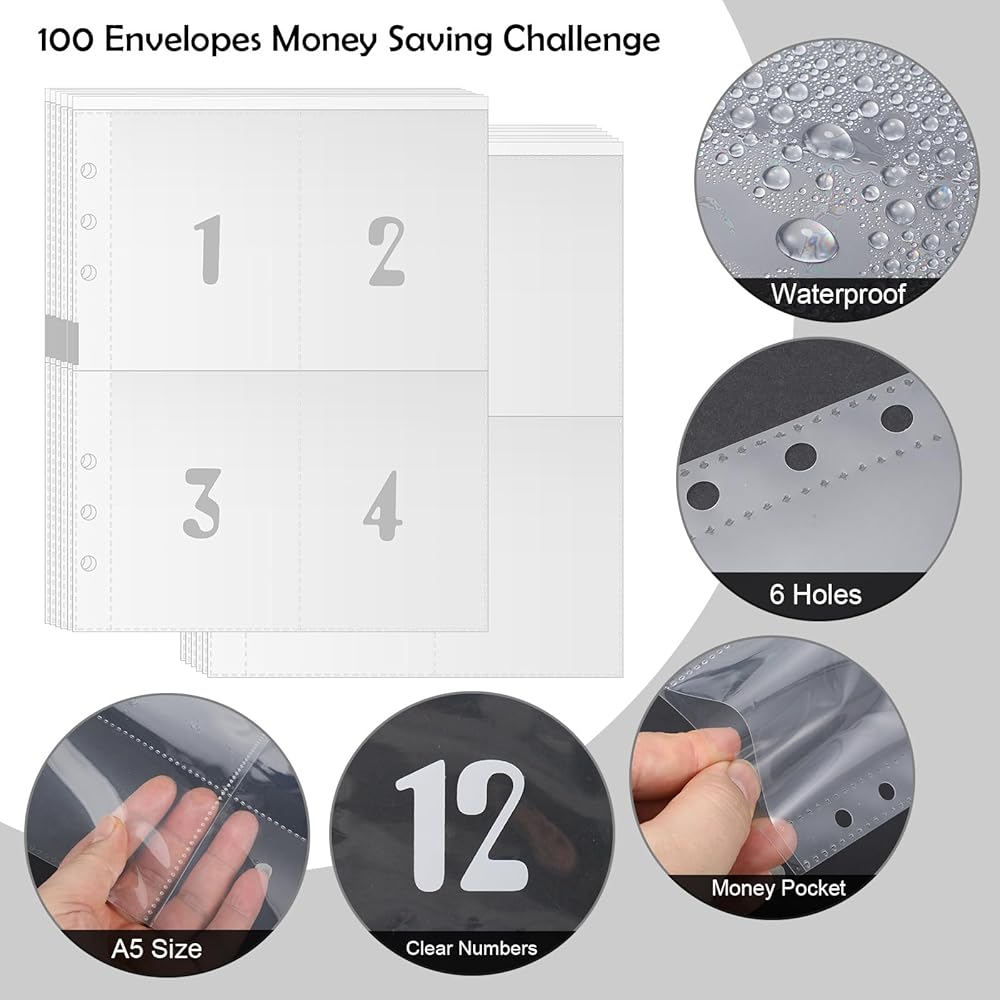 【تصميمان】تصميمان لمجموعة إدراج مجلد بحجم A5، أحدهما لتحدي التوفير بقيمة 5050 دولارًا لمدة 100 يوم. ويمنحك خيار آخر الحرية في إعداد تحديات ادخار لمدة 30 يومًا و52 أسبوعًا. تلبية احتياجات الادخار الخاصة بك بمبالغ مختلفة أو فترات زمنية مختلفة!