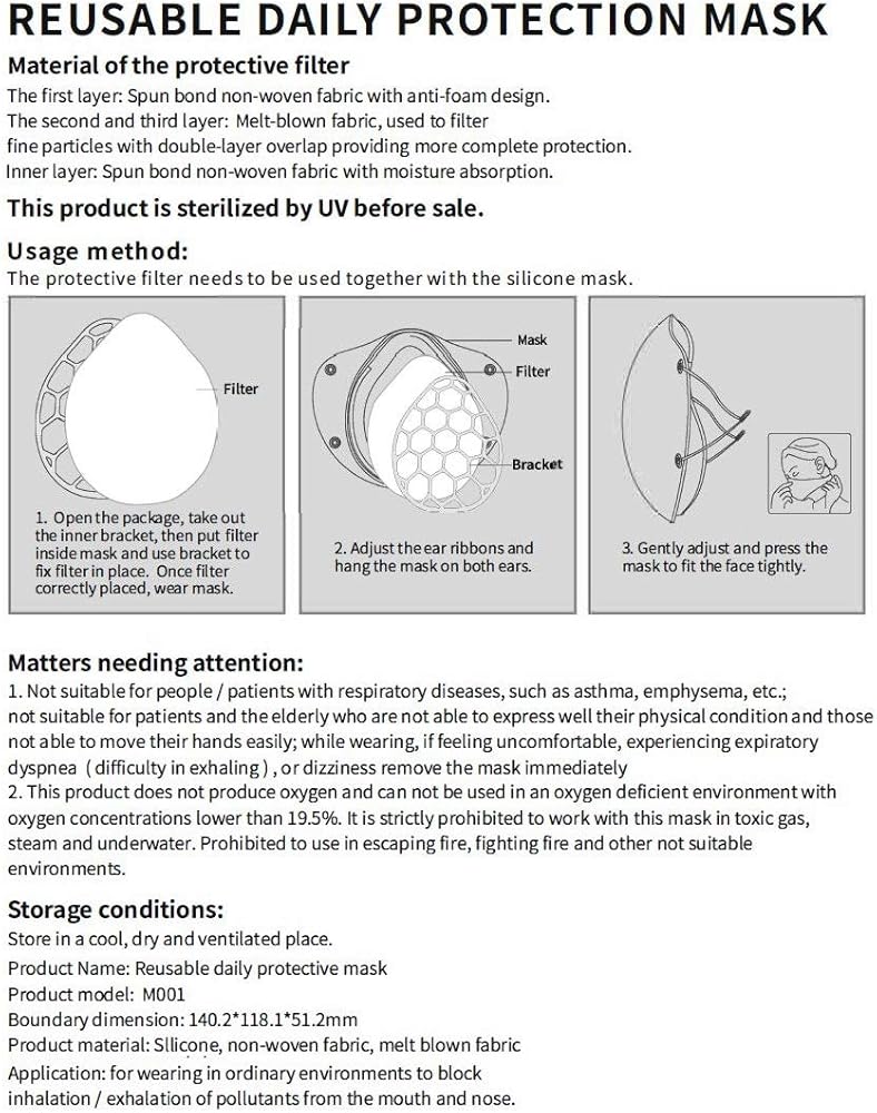 With ten (10) included 4-layer replaceable inner filters and easy clean/sanitize/disinfect silicone material the reusable silicone masks can serve a wide range of protective uses.