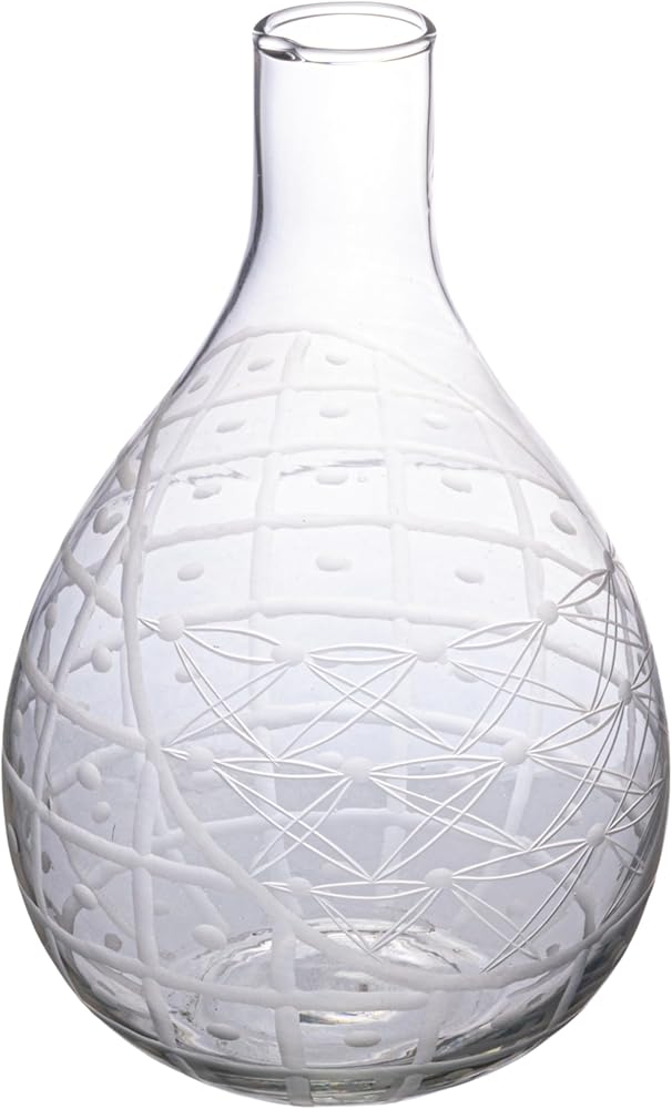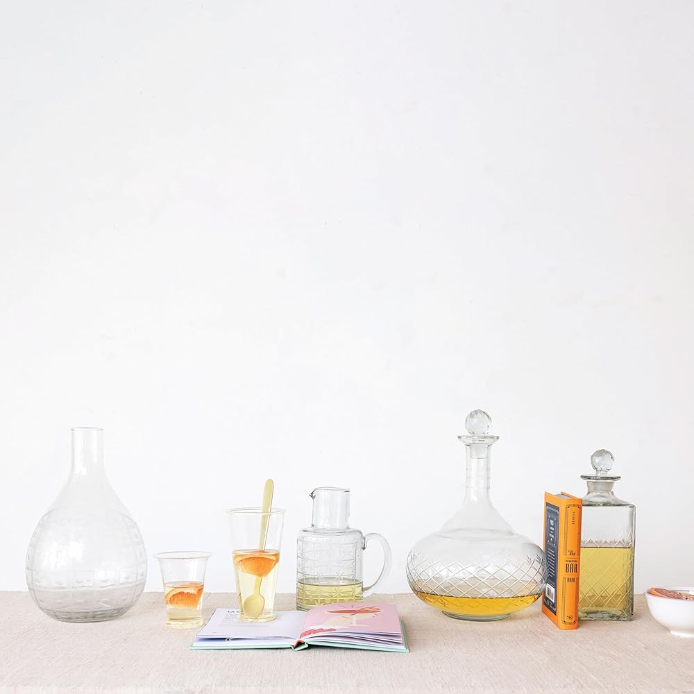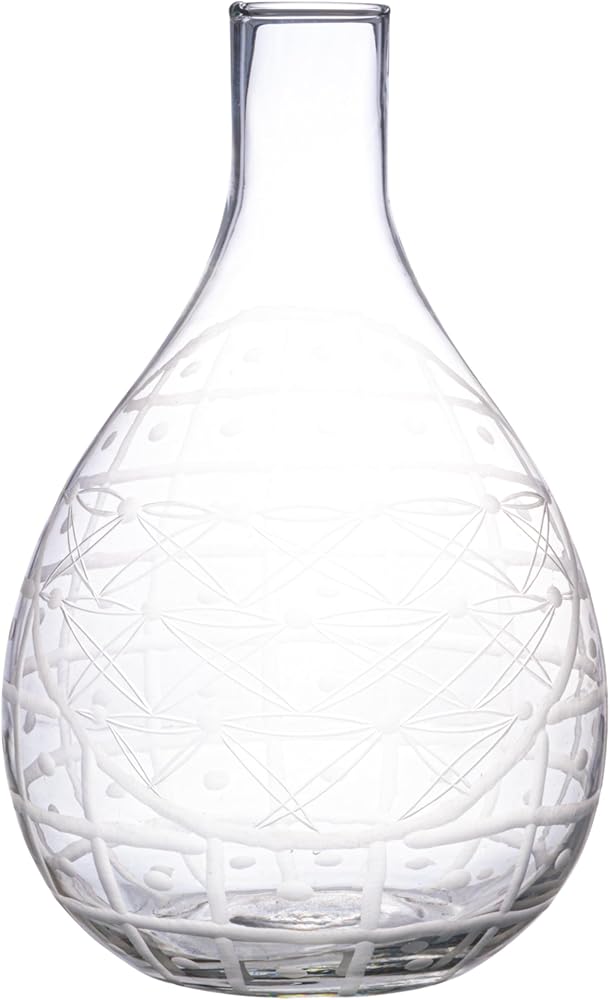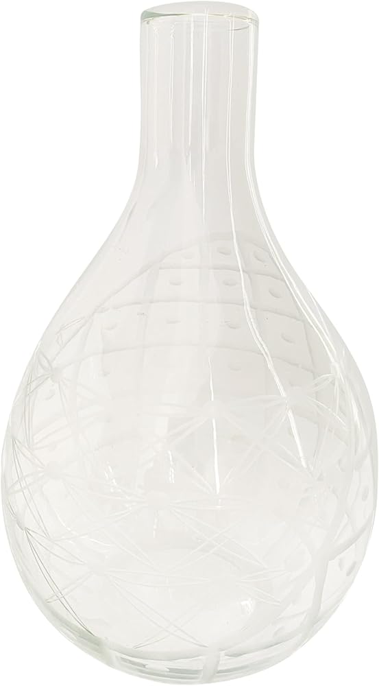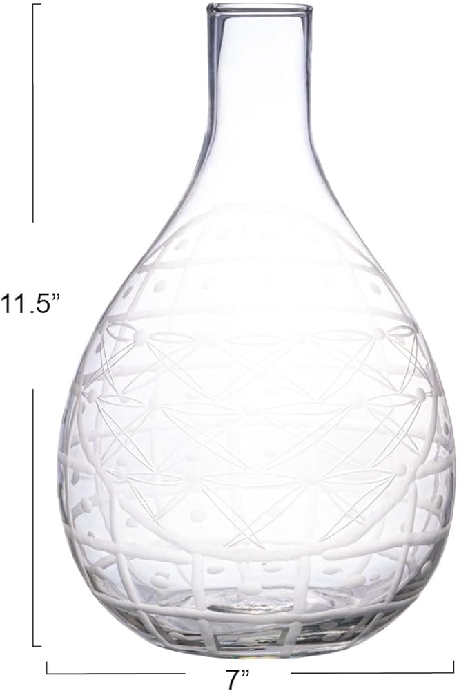 This hand-blown etched reclaimed glass pitcher is a beautiful and versatile serveware piece that can elevate any dining or living space. The pitcher features an elegant floral etching that adds a touch of charm and sophistication. The handleless shape gives the pitcher a sleek and modern look, while also making it easy to pour and hold. The clear glass material is made of reclaimed glass that is hand-blown by skilled artisans, making each pitcher one-of-a-kind and environmentally friendly. The pitcher can be used as a vase to display fresh or dried flowers, or as a pitcher to serve water, juice, or wine. The pitcher measures 7 inches in diameter and 11.75 inches in height, with a capacity of 3.5 quarts. It is a perfect choice for anyone who loves farmhouse, cottagecore, French country, or coastal style.