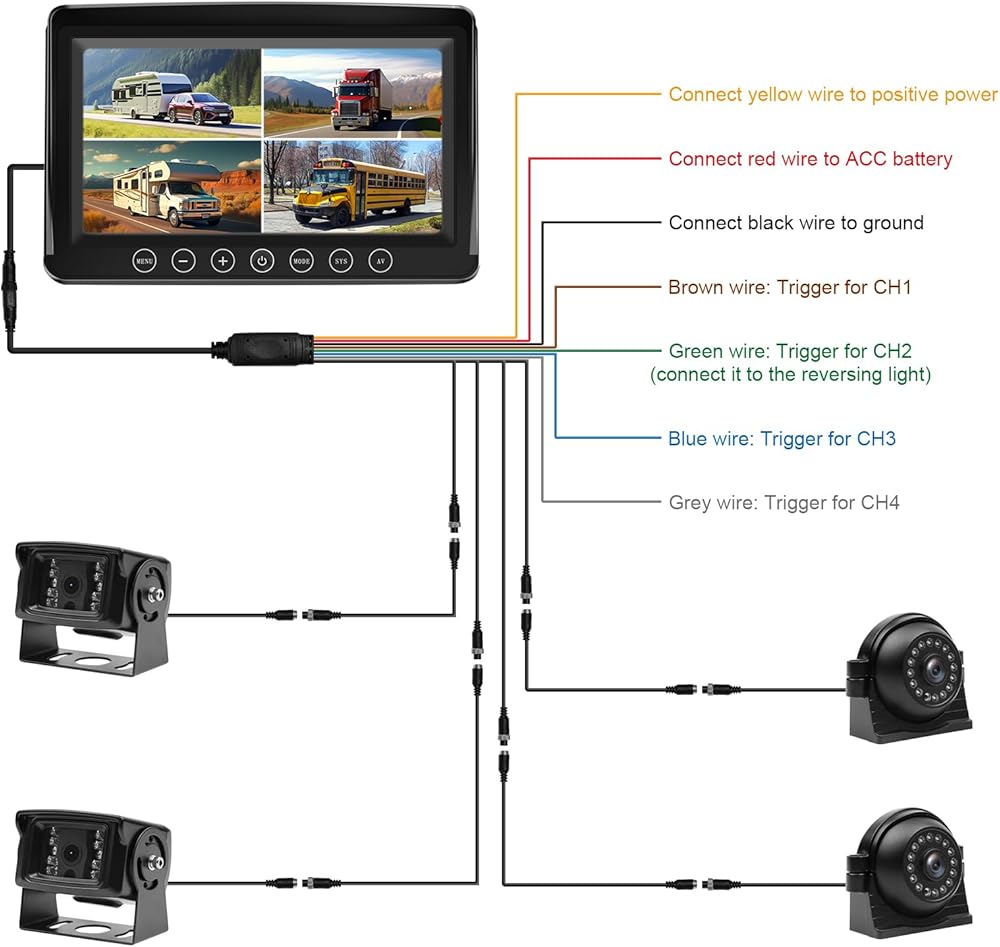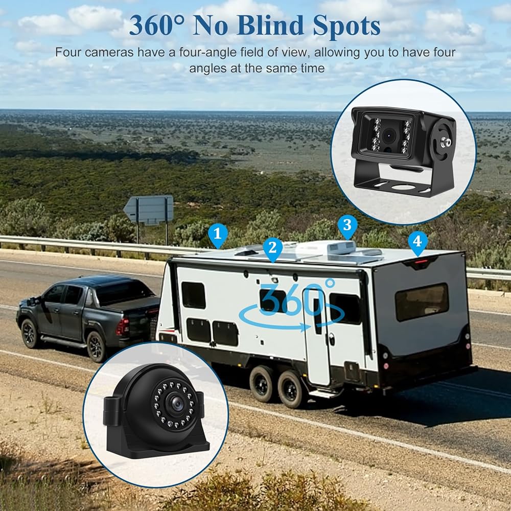 ►[شاشة AHD ذات 4 قنوات] يمكن إضافة ما يصل إلى أربع كاميرات رؤية خلفية/كاميرات رؤية جانبية/كاميرات رؤية أمامية. يمكن أن يكون فعالاً للغاية في مساعدتك على تقليل الضغط الناتج عن فحص النقاط العمياء عند تغيير الممرات، وإجراء تأكيدات السلامة، وفحص الحمولة في السيارة. تتمتع جميع الكاميرات الاحتياطية الأربعة بقدرات الرؤية الليلية. وفي الوقت نفسه، يستخدمون جميعًا تقنية AHD عالية الوضوح لتحقيق جودة صورة عالية الوضوح 1080P.
