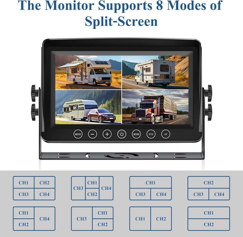 نظام كاميرا احتياطية سلكية مع شاشة IPS 4 مقسمة مقاس 9 بوصات + 4 كاميرات مع كاميرا رؤية خلفية، مع كاميرا رؤية أمامية جانبية 18 الأشعة تحت الحمراء للرؤية الليلية مقاومة للماء للمركبات الترفيهية والمقطورة والحافلات والشاحنات BX94