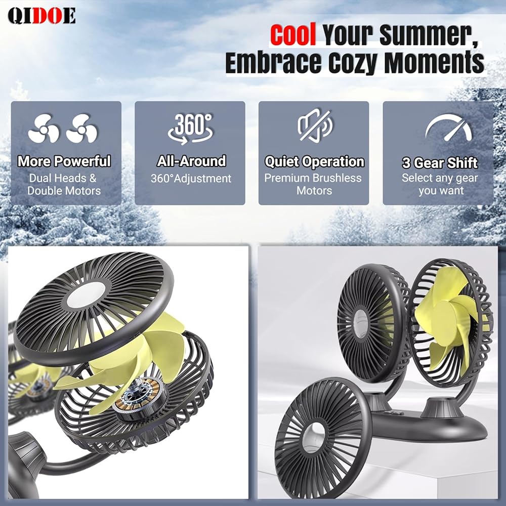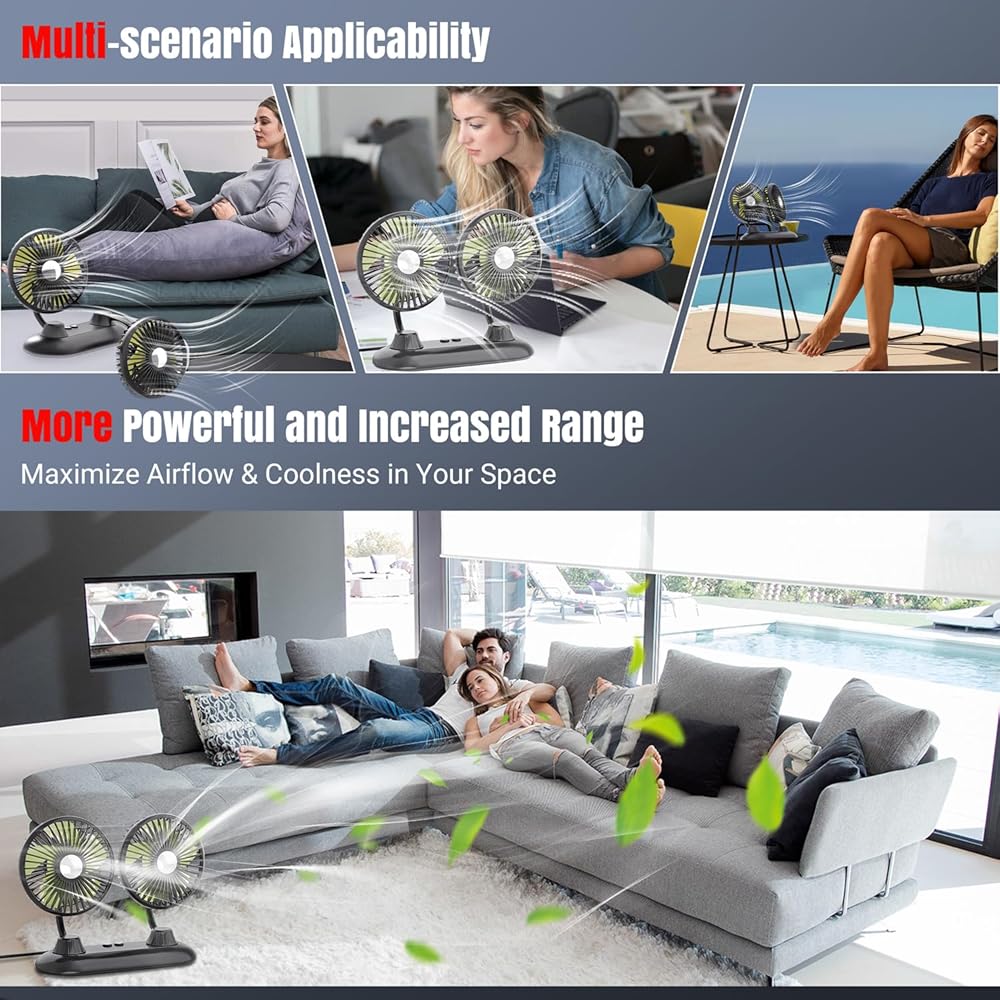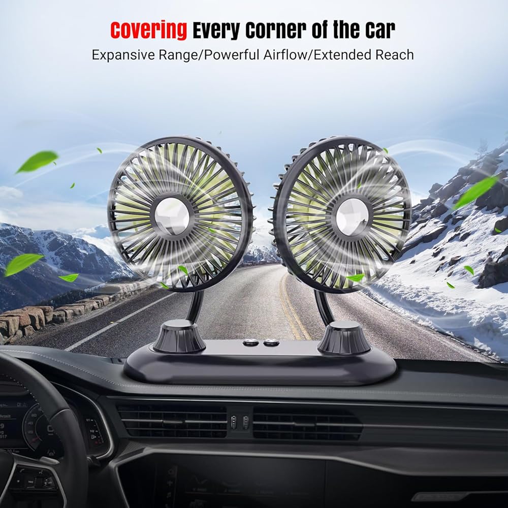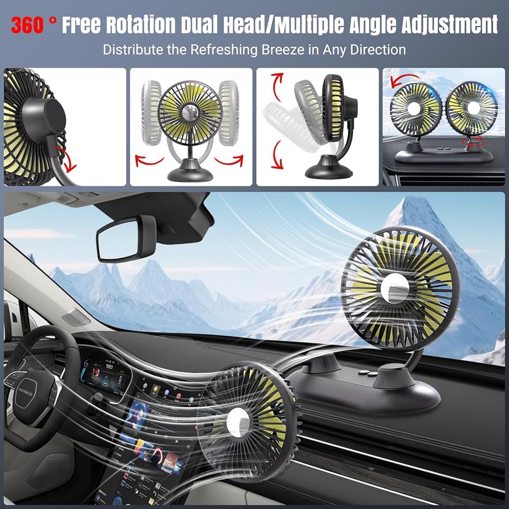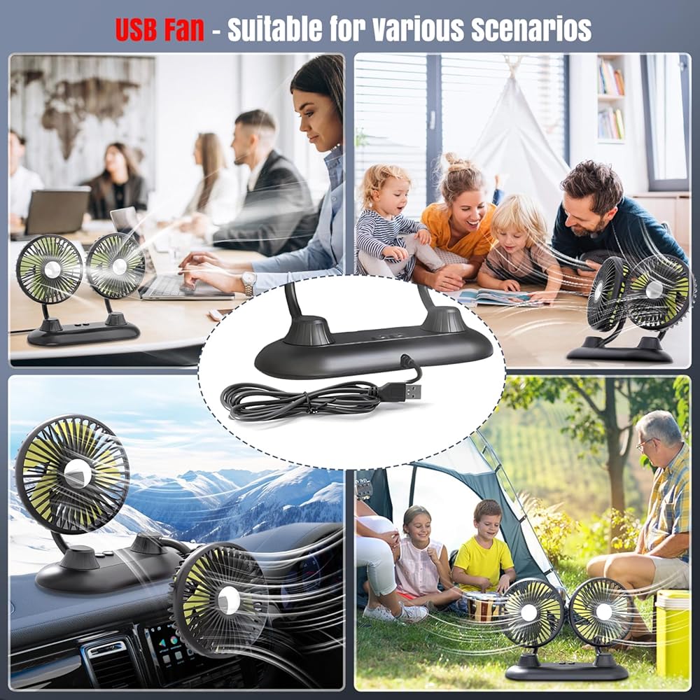 مروحة سيارة، مروحة USB محمولة للسيارة مع 3 سرعات رياح، مراوح سيارة مزدوجة الرأس قابلة للدوران 360 درجة، مراوح سيارات كهربائية قوية للرياح للوحة قيادة السيارة SUV RV شاحنة قارب فان سيدان والمكتب المنزلي