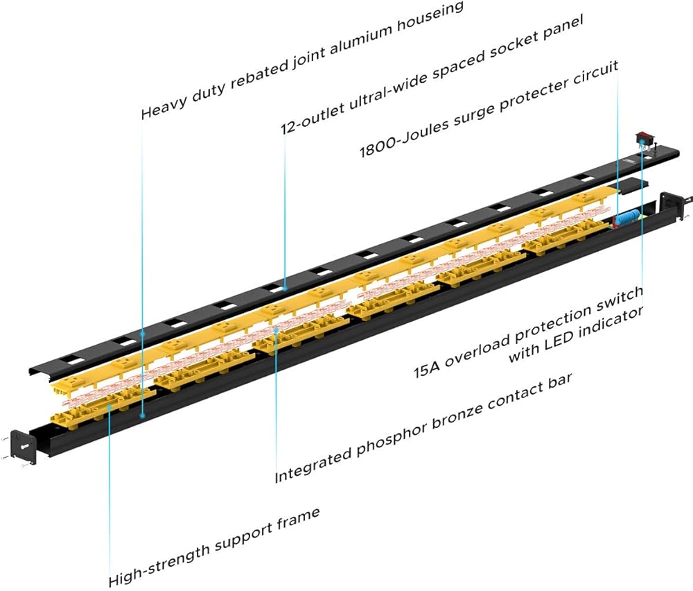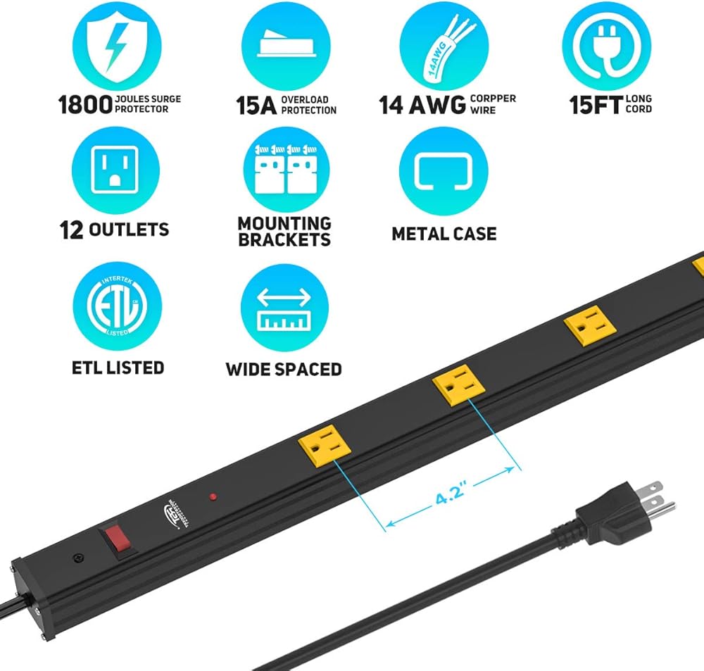 • [ميزات شديدة التحمل وقائمة ETL]: هيكل قوي مع غطاء معدني سميك من سبائك الألومنيوم، وألواح بلاستيكية مقاومة للهب تجعل شريط الطاقة قويًا بما يكفي لتحمل الصدمات والحرارة. معتمد من ETL (الولايات المتحدة-كاليفورنيا)، التصنيف الكهربائي 15 أمبير / 125 فولت / 1875 وات