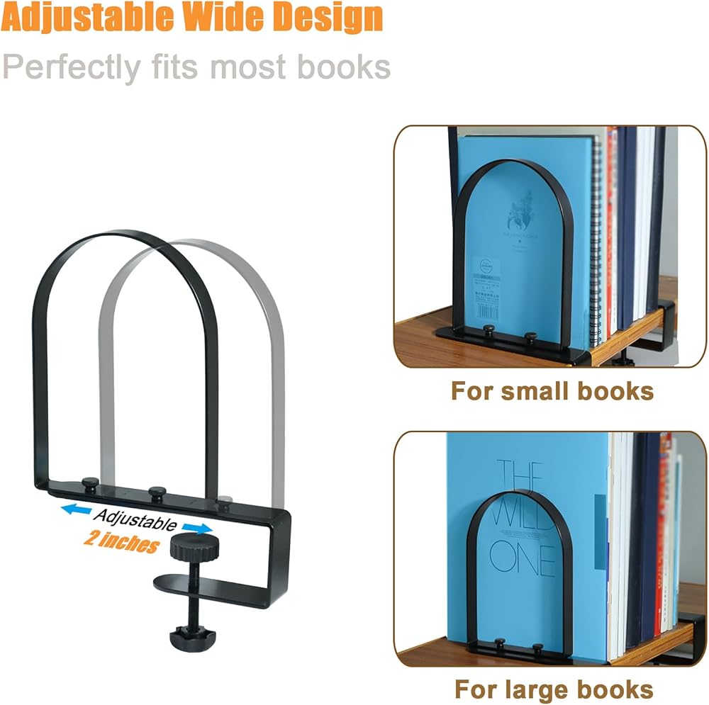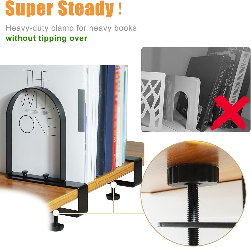 ROCK-SOLID STABILITY - Our Clamped Book Ends redefine shelf stability. With dual parallel arms that elegantly embrace your shelf, they ensure your books stand tall and proud, free from the woes of sagging shelves.