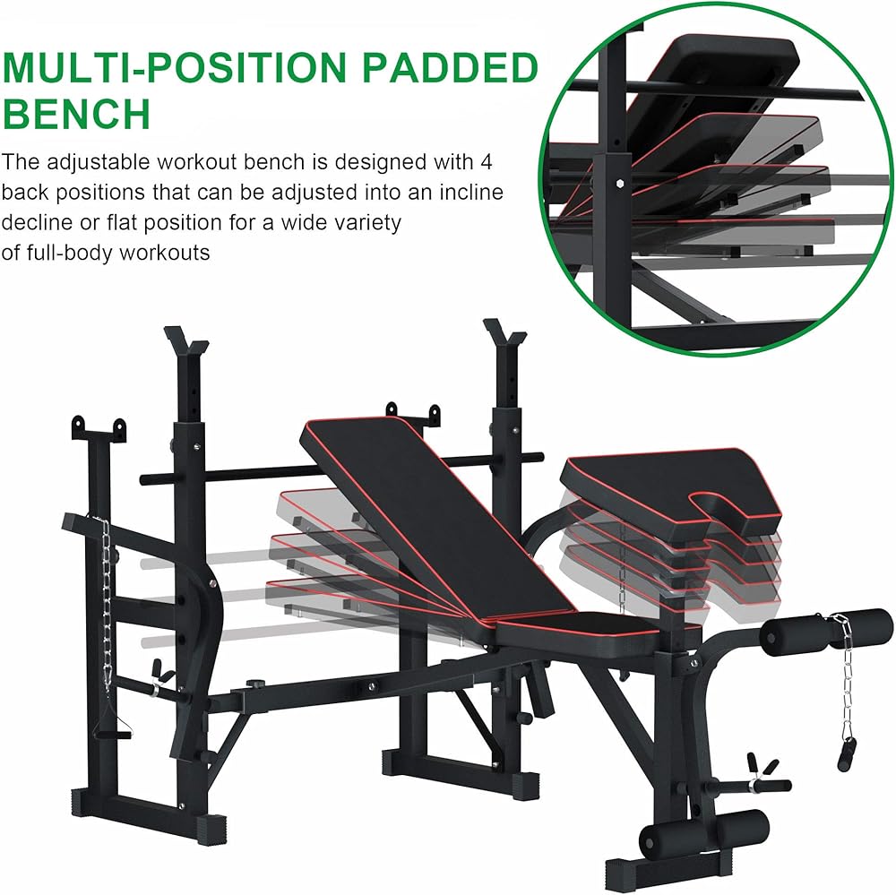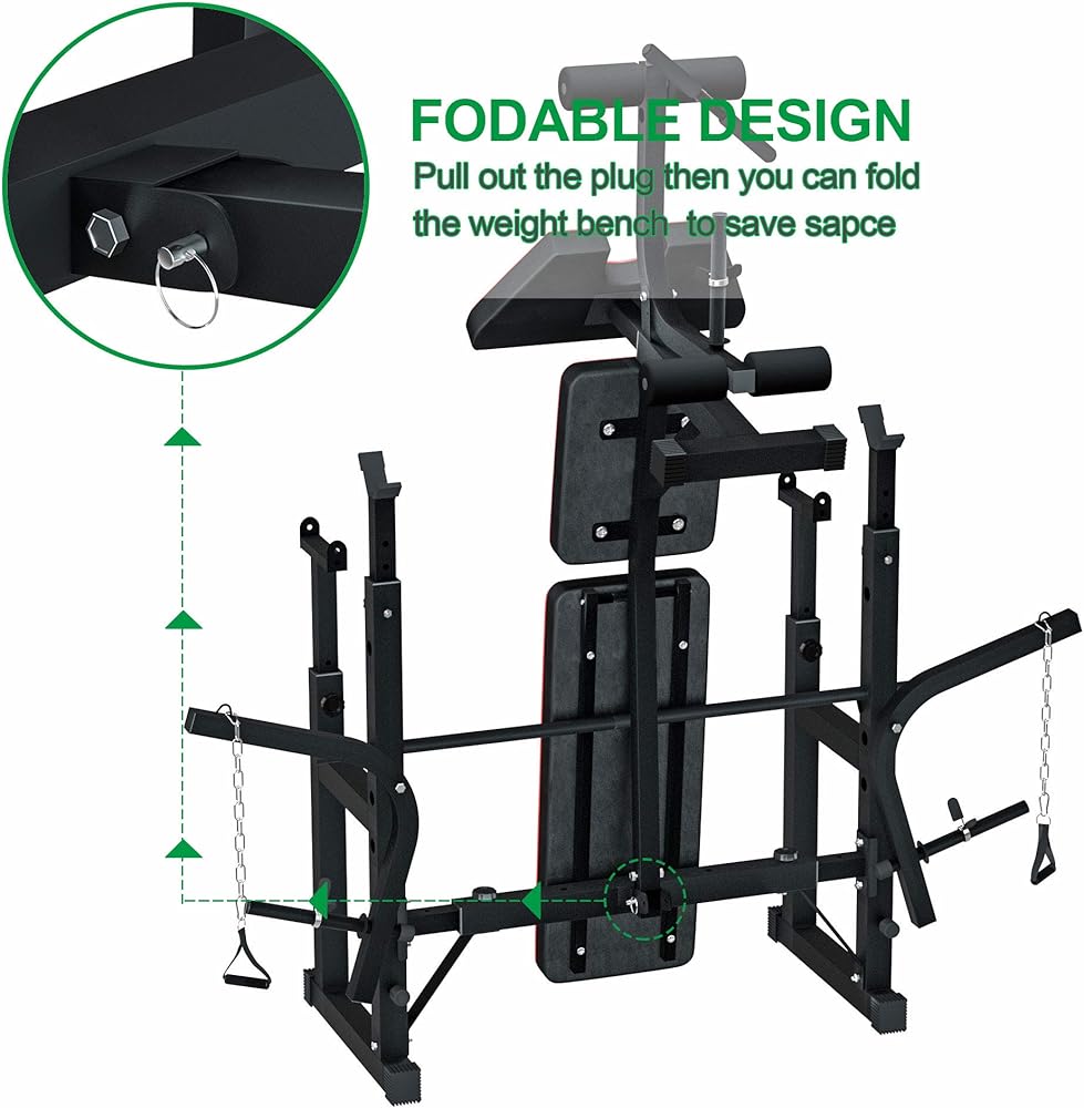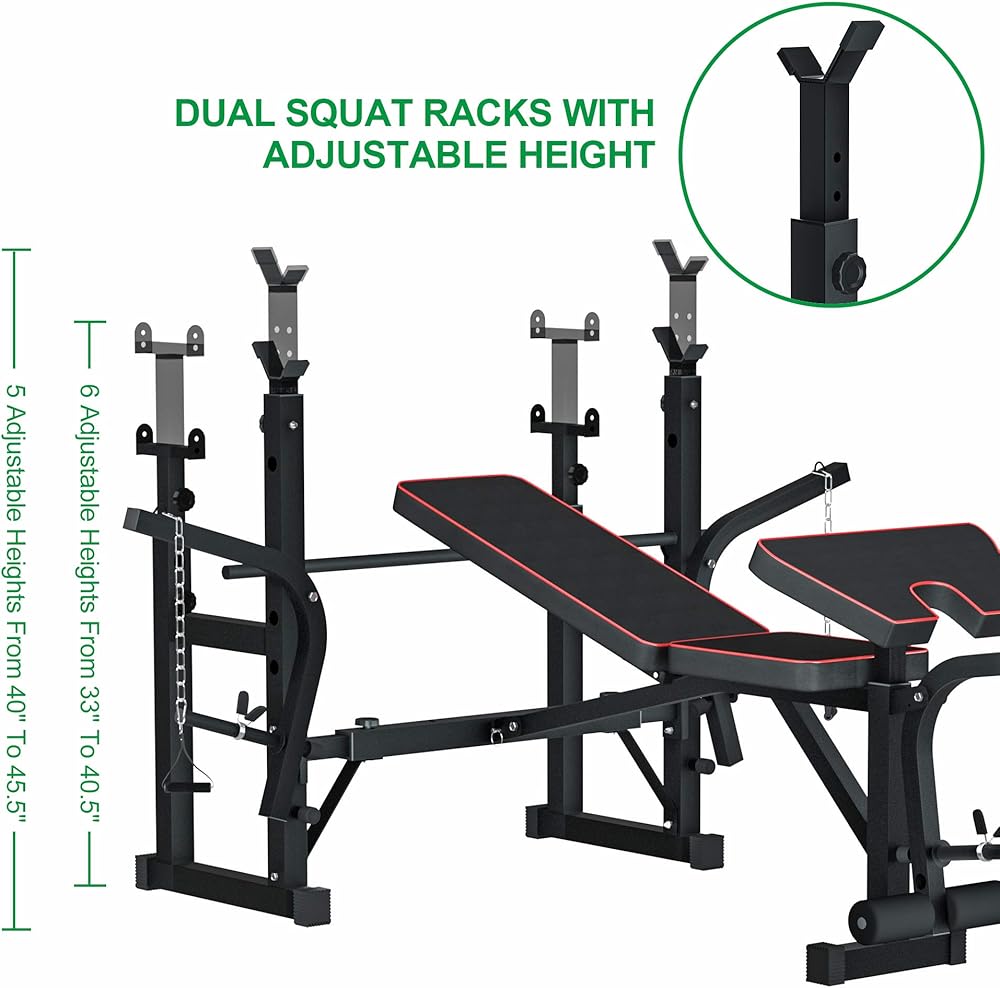 【Heavy-Duty and Adjustable】Our Olympic bench is made of high carbon steel with a thickened bottom tube, providing maximum stability for a user weight of up to 330lbs and a weight set of 330lbs. The dual squat racks can be adjusted from 30.5"-41.5" in width, while the higher barbell rack can be adjusted from 40"-45.5" and the rear rack from 33"-40.5" in height.