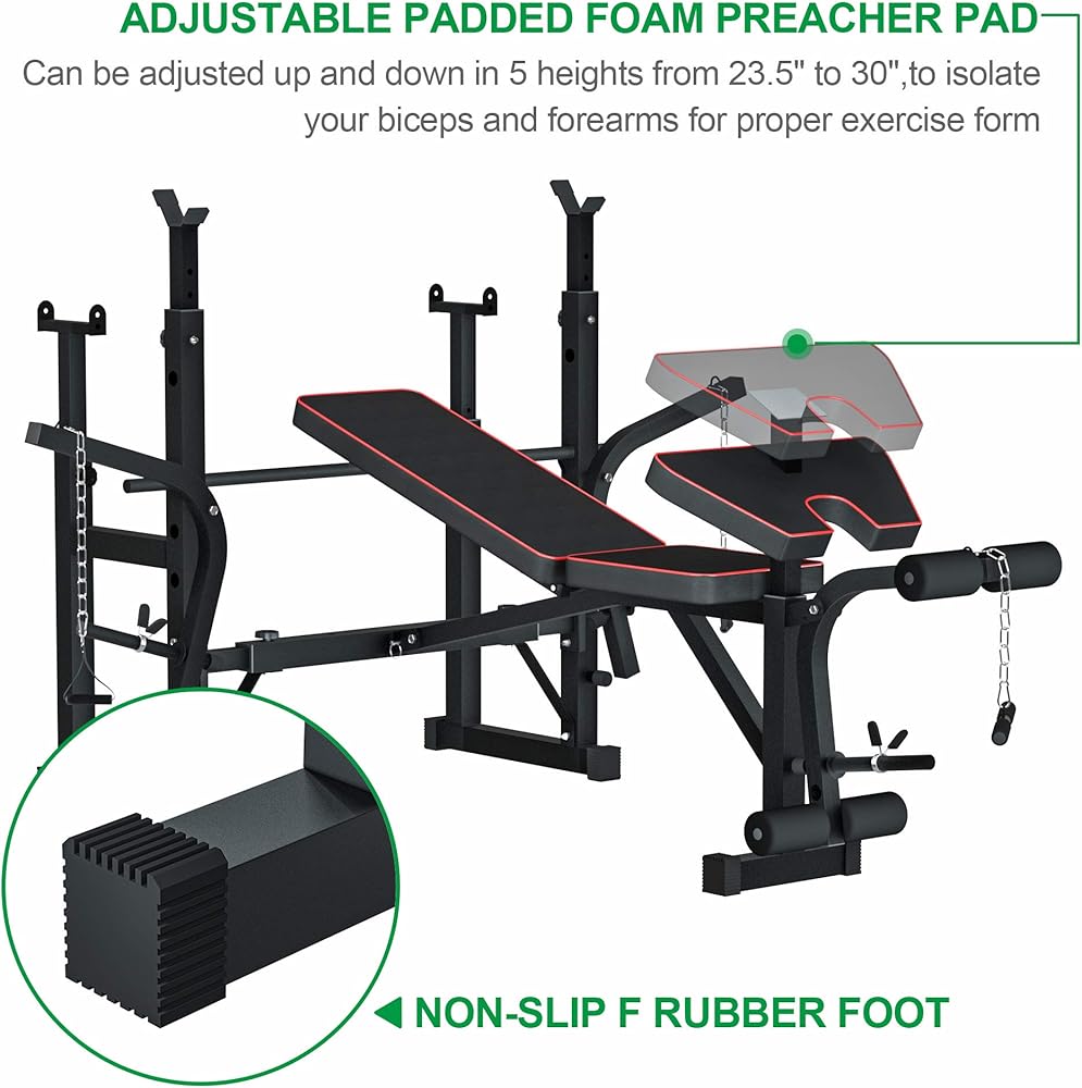 【Versatile Leg Training and Preacher Pad】This bench station comes equipped with a dual-action leg developer, perfect for building your quadriceps, hamstrings, glutes, flute muscles, and hip flexors. It also includes four padded foam rollers to provide maximum comfort for your ankles and knees. The adjustable preacher pad can be modified in height from 23.5" to 30", working your biceps and forearms.