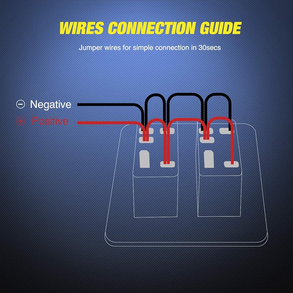 Nilight 2 Gang Pre-Wired Rocker Switch Panel with Red Backlit Product Description: Rocker Switch: ON/OFF 2 Gang 5 Pin Switch Rocker Switch Power: Rated at 20Amp 12V/DC and 10Amp 24V/DC Operating Voltage: 12-24V Switch Type: Rocker switch, SPST IP Rating: IP65 How to Connect Black Wire connects the negative Red Wire connects the positive It is mainly used for controlling the LED light fixtures of car, boat and yacht, such as led light bar, headlights, tail lamps, work lights, fog lights, auxiliary lights and so on.