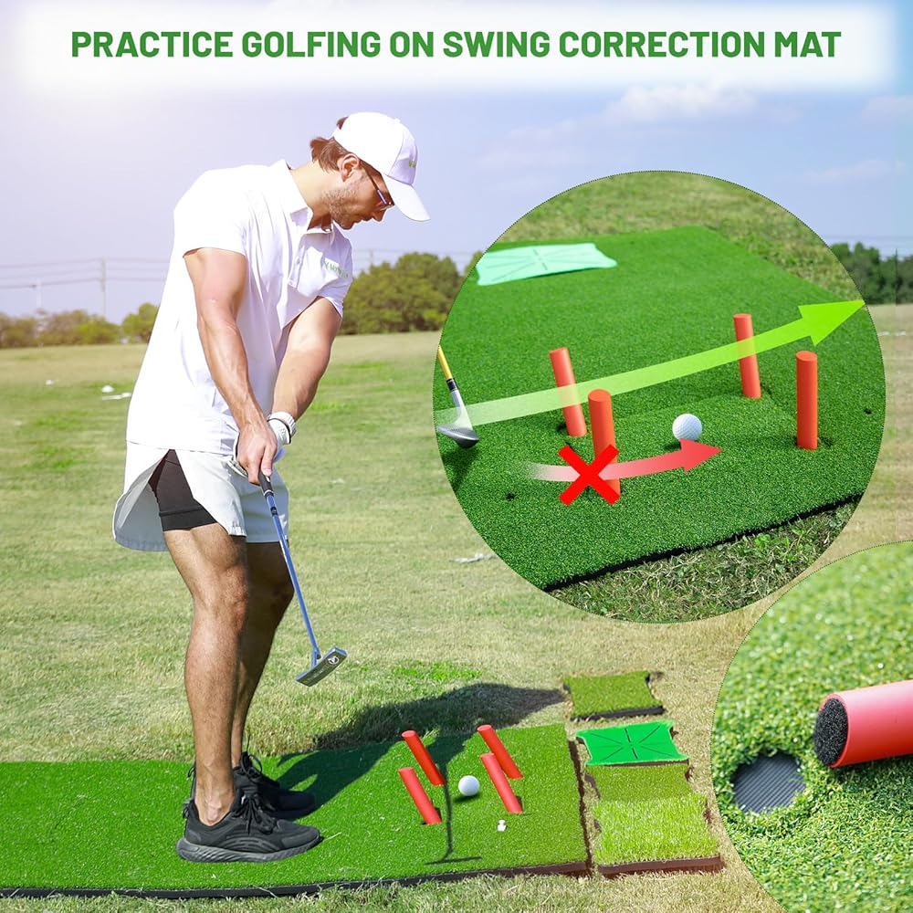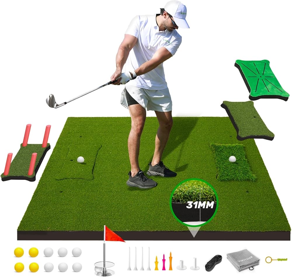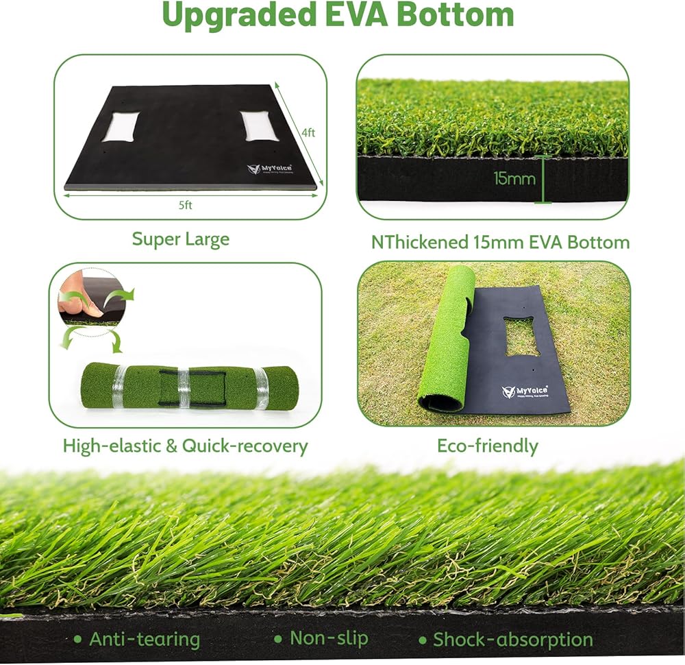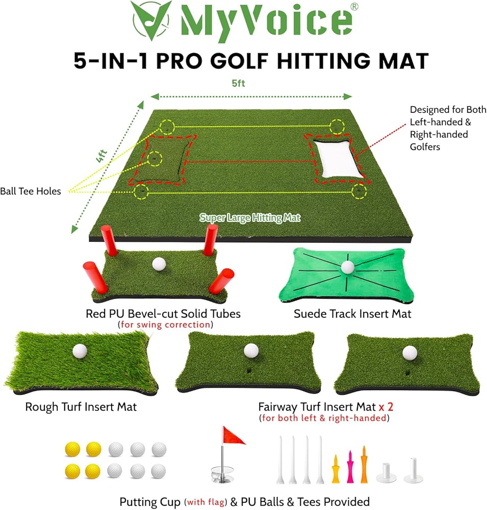سجادة جولف احترافية للتدريب النهائي: سجادة الجولف من MyVoice مقاس 5 × 4 أقدام، بسمك 1.2 بوصة مع سجادات ضرب قابلة للتبديل، هي الحل الشامل لتدريب الجولف في الأماكن المغلقة أو الهواء الطلق. مصممة للاعبي الجولف من جميع المستويات، تعمل سجادة تدريب الجولف متعددة الاستخدامات هذه على تحسين التأرجح، يصحح الخطافات والشرائح، ويعمل بمثابة سجادة تدريب أساسية للجولف.ارفع مستوى لعبتك دون عناء.