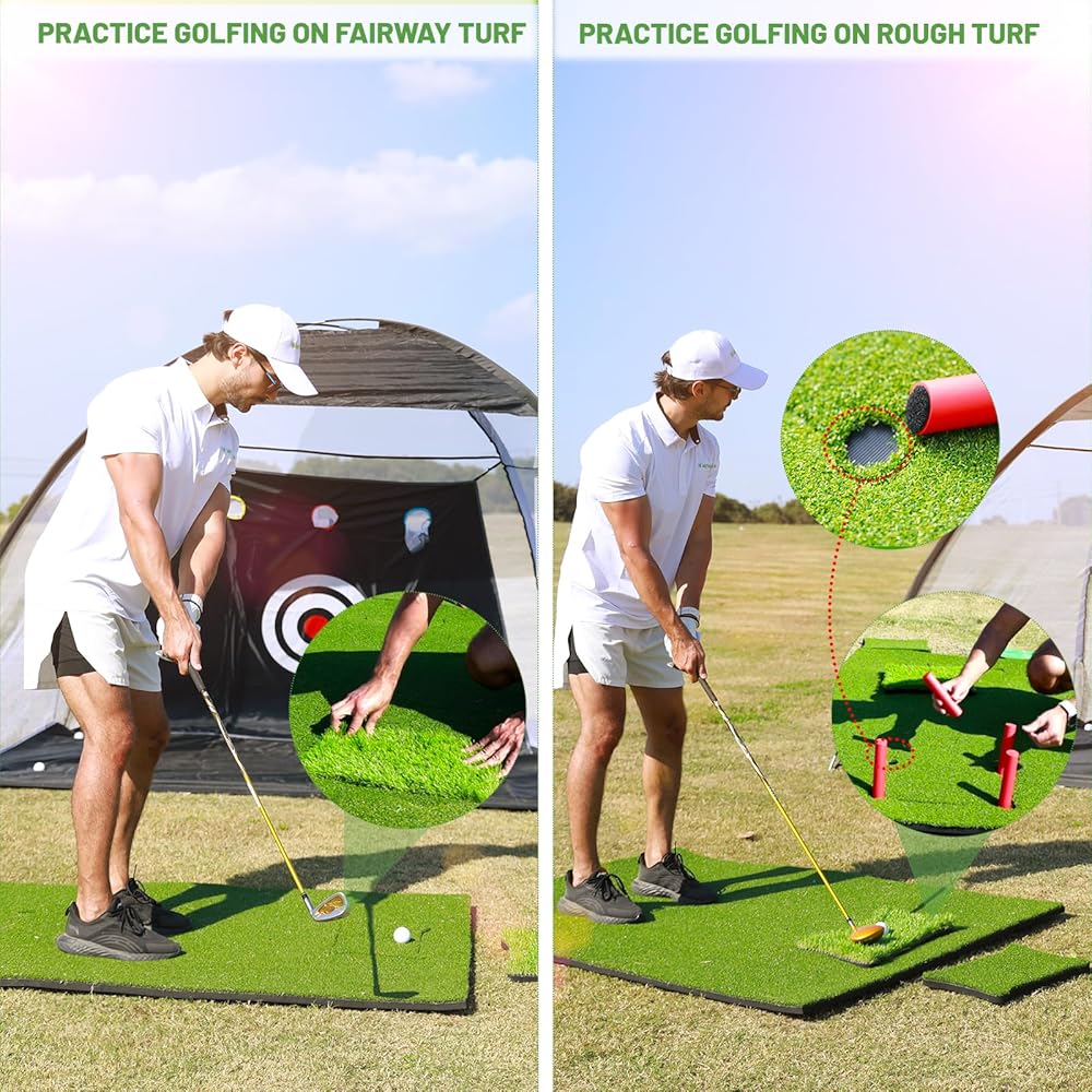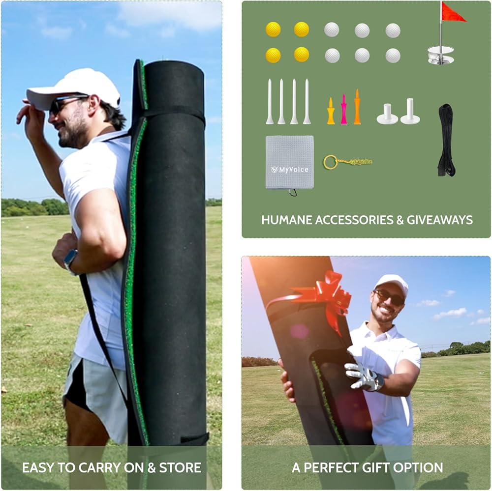 ممارسة جولف متعددة الاستخدامات في الداخل/الخارج: حصيرة الجولف من MyVoice هي الحل الأمثل لممارسة الجولف المريحة والفعالة. مصمم للاستخدام الداخلي والخارجي، فهو يسمح لك بتحسين مهاراتك في إعدادات مختلفة، سواء كان ذلك في الفناء الخلفي أو المرآب أو أي مساحة متاحة. توفر هذه السجادة متعددة الاستخدامات، مع ميزات مثل بساط الجولف وبساط الجولف الأخضر وعشب الجولف عالي الجودة، تجربة تدريب شاملة. هدية مثالية (هدية عيد الميلاد/السنة الجديدة) لعشاق الجولف من جميع الأعمار.