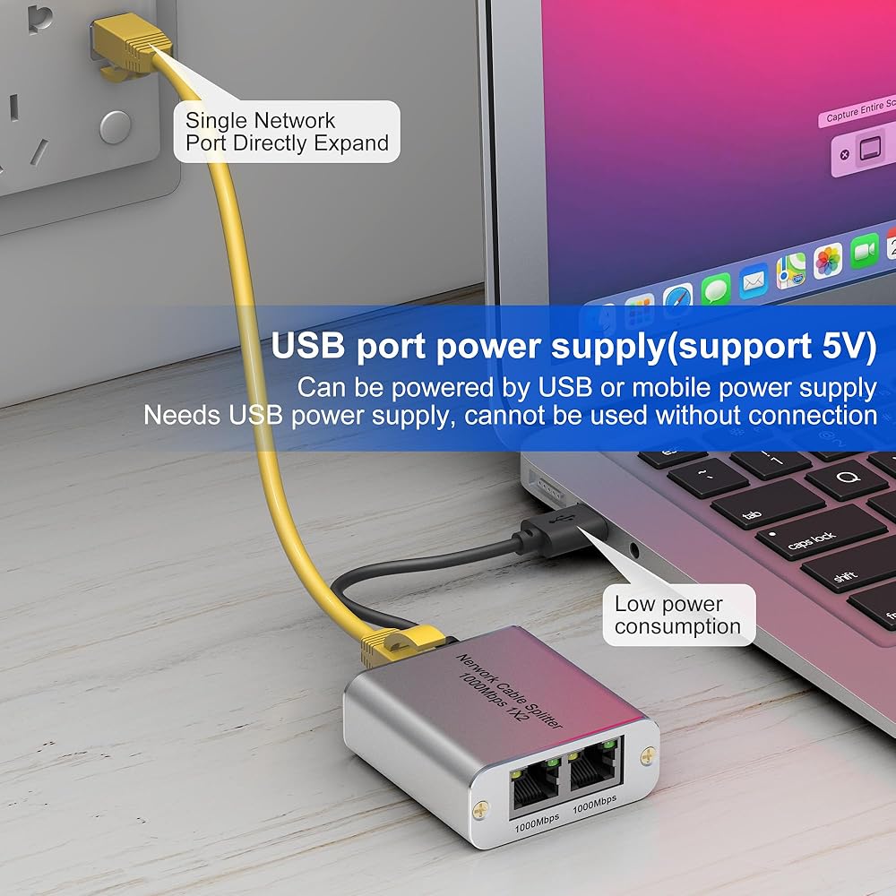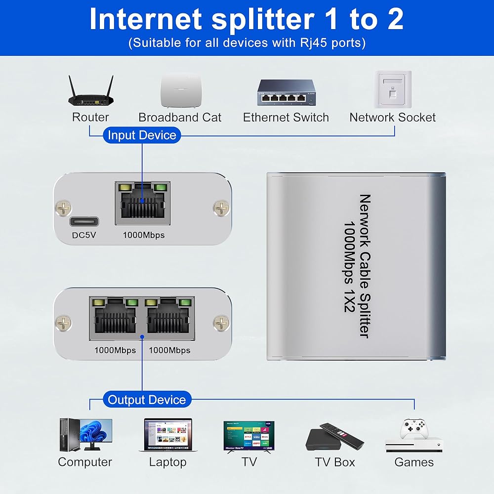 موزع إيثرنت 1 إلى 2 عالي السرعة 1000 ميجابت في الثانية، محول جيجابت إيثرنت 2 منفذ [جهازان للشبكات في وقت واحد]، موزع إنترنت موزع إيثرنت RJ45 لكابل Cat5/5e/6/7/8