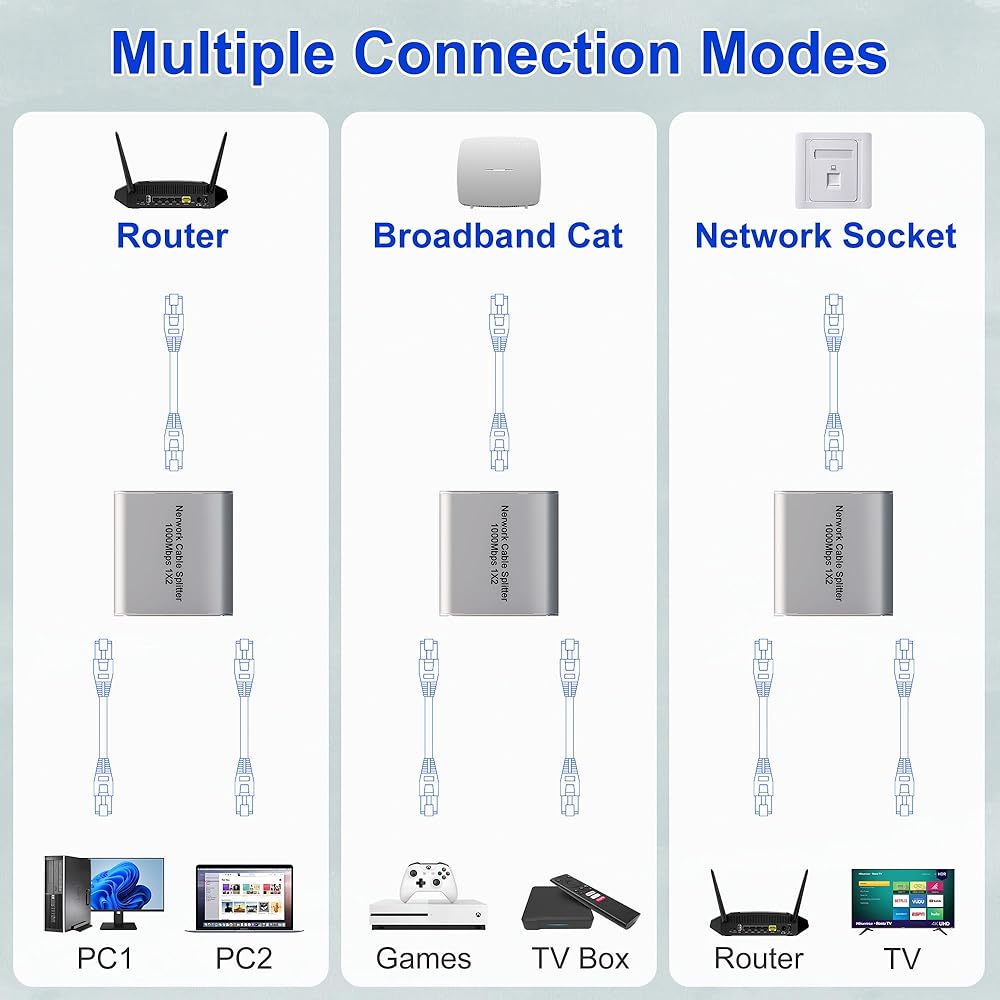 نطاق واسع من التوافق: يعمل موسع الاتصال عالي السرعة Cat 5 Splitter 1 إلى 2 مع كابل إيثرنت شبكة Cat8 Cat7 Cat6 Cat5 Cat5e ويمكن استخدامه مع ADSL والمحاور والمفاتيح وأجهزة التلفزيون وصناديق الاستقبال وأجهزة التوجيه والأجهزة اللاسلكية وأجهزة الكمبيوتر ، إلخ.