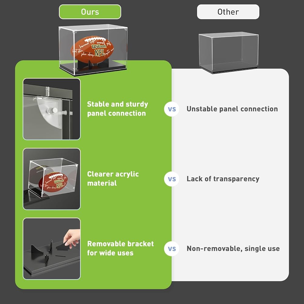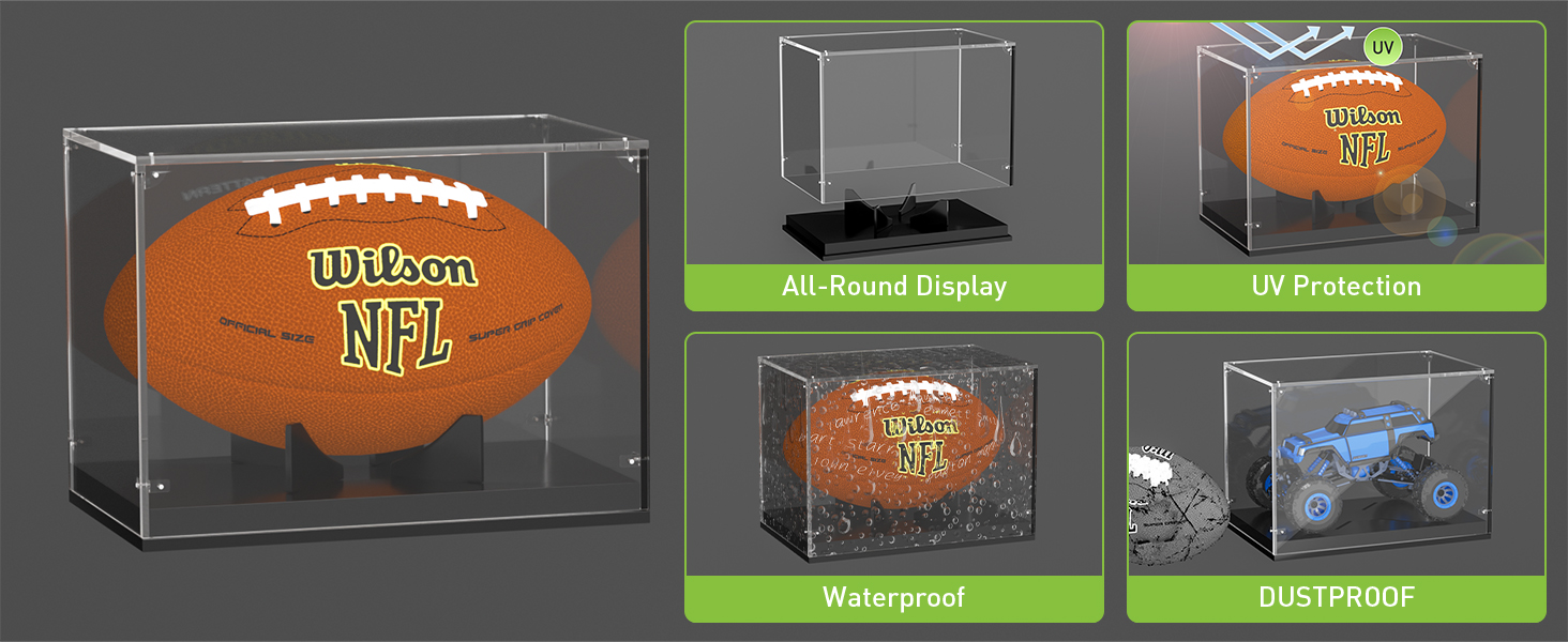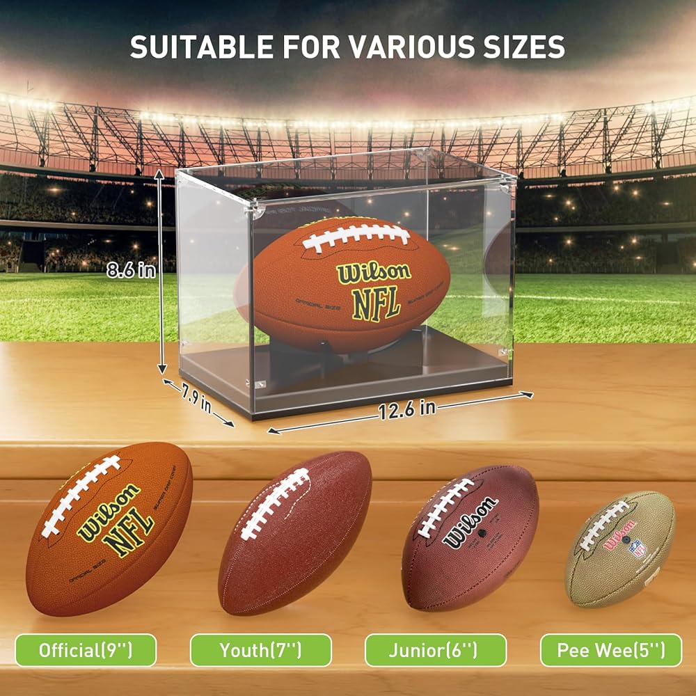 🏈تطبيق متعدد الوظائف - حامل علبة عرض كرة القدم الشفافة قابل للإزالة. يمكنك استخدامه للتخزين لوضع أي حجم مناسب للمقتنيات. مثل الألعاب، والحرف اليدوية، ونماذج السيارات والطائرات، وشخصيات الحركة، وما إلى ذلك.