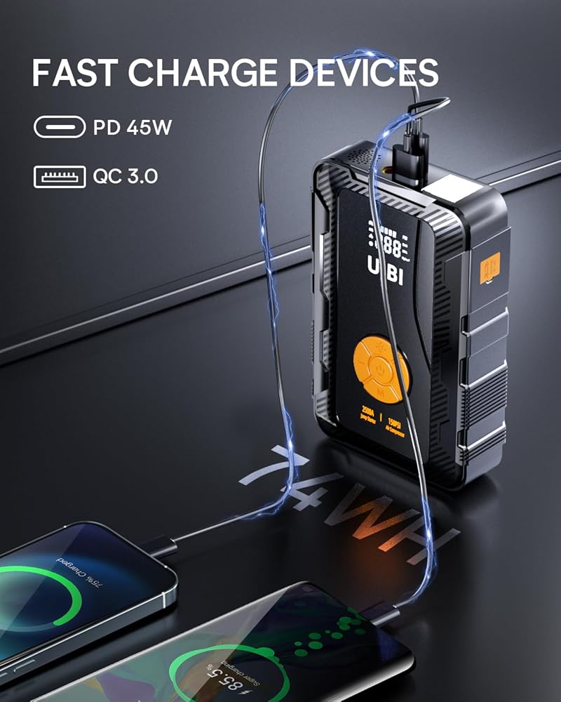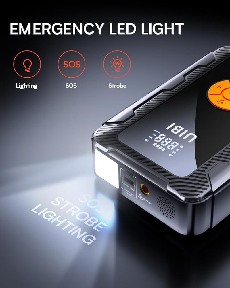【جهاز تشغيل القفز متعدد الوظائف 4 في 1】تدمج حزمة بطارية التشغيل السريع UIBI X7 بين مشغل القفز وضاغط الهواء وبنك الطاقة المحمول وإضاءة LED ثلاثية الأوضاع (مصباح يدوي، ستروب، SOS). لا غنى عنه في أي مجموعة رحلات على الطريق لتحدي التجارب التي تقطعت بها السبل بسبب البطارية الفارغة أو الإطار المثقوب. مع منفذ شحن سريع ثنائي الاتجاه من النوع C PD45W ومخرج QC3.0 USB-A لتلبية احتياجات الشحن الأسرع في حالات الطوارئ بشكل أفضل. ويمكنه بسهولة التعامل مع المهام مثل إضاءة أحلك الليالي/إرسال إشارات SOS.