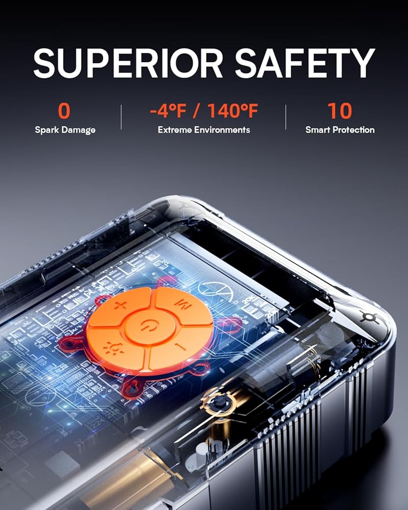 【نظام حماية ذكي شامل】يجتاز جهاز تشغيل بطارية UIBI المحمول شهادة UL-2743، مع تصميم تبديد الحرارة لتحسين الأداء بنسبة 35%. تتميز المشابك المعدنية شديدة التحمل بنطاق فتح أكبر وكابلات توصيل ممتدة لتوصيل أفضل وتشغيل أسهل. 10 وسائل حماية مدمجة للسلامة (مقاومة الشرارة، القطبية العكسية، دائرة كهربائية قصيرة، إلخ.) ومؤشر صوت تنبيه في الوقت المناسب لاكتشاف الاتصال تلقائيًا، سوف يحرر كل مخاوفك بشأن سوء الاستخدام والشرر