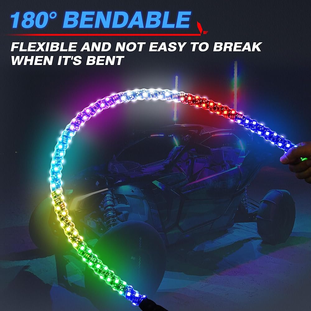 🌈 قطعتان من أضواء السوط المطورة بطول 3 أقدام ➤ قابلة للانحناء بزاوية 180 درجة، وتصميم حلزوني 360 درجة. تعمل قاعدة الزنبرك وقواعد سبائك الألومنيوم على تعزيز المرونة وتقليل الكسر. مصابيح LED RGB عالية السطوع 300 قطعة بحد أقصى. 860LM لتأثير مبهر وإضاءة أكثر سطوعًا. IP68 مقاوم للماء، ومتين، ومقاوم للغبار، ومقاوم للصدأ، ويدوم طويلاً.