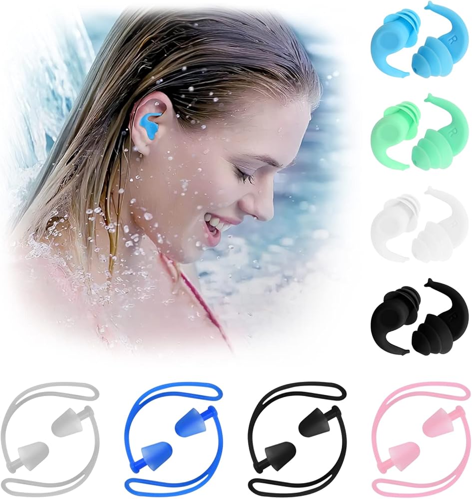 سدادات أذن للسباحين، 8 أزواج، سدادات أذن للسباحة مريحة للغاية ومقاومة للماء، مناسبة عالميًا مع حبل، للسباحة وركوب الأمواج والغوص والأنشطة المائية الأخرى
