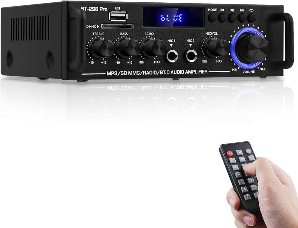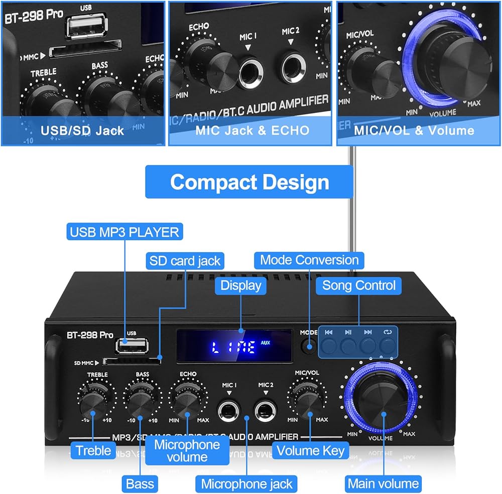 🎵 ترقية مضخم الصوت الرقمي BT-298Pro 🔊 تصميم مطور بالكامل، طاقة مصنفة 50 وات + 50 وات، مناسب تمامًا لمكبرات الصوت السلبية مقاس 4-16 بوصة. مع وظائف راديو Treble وBass وECHO وFM، مع مقبس USB/SD ومقبس إدخال الميكروفون. اتصال بلوتوث 5.0 لاسلكي للأجهزة الصوتية. مضخم صوت ستيريو هاي فاي مع أجهزة التحكم عن بعد، عند تشغيل الموسيقى، يمكنك تبديل 6 تأثيرات معادلة مختلفة مدمجة في المشغل، مناسبة لنظام صوت المسرح المنزلي.