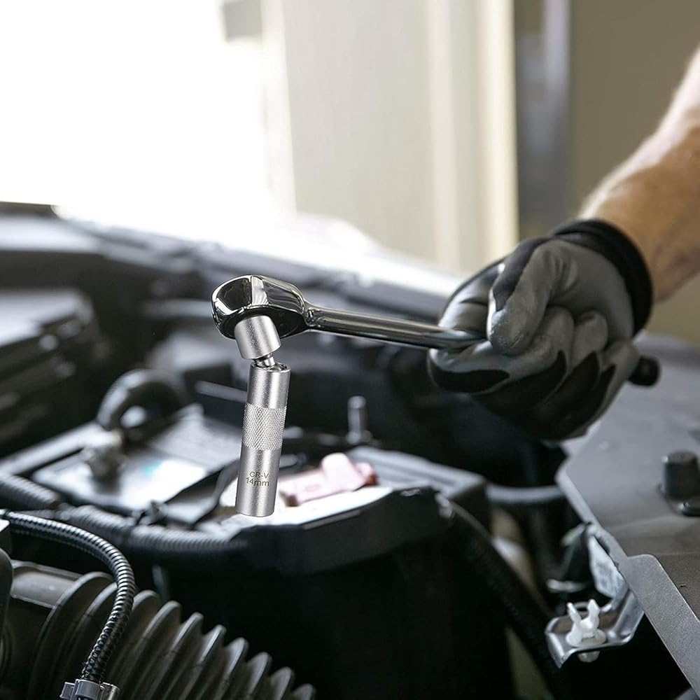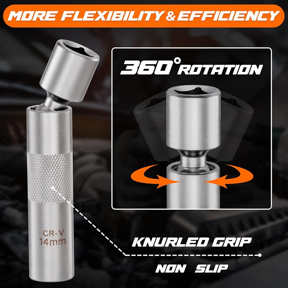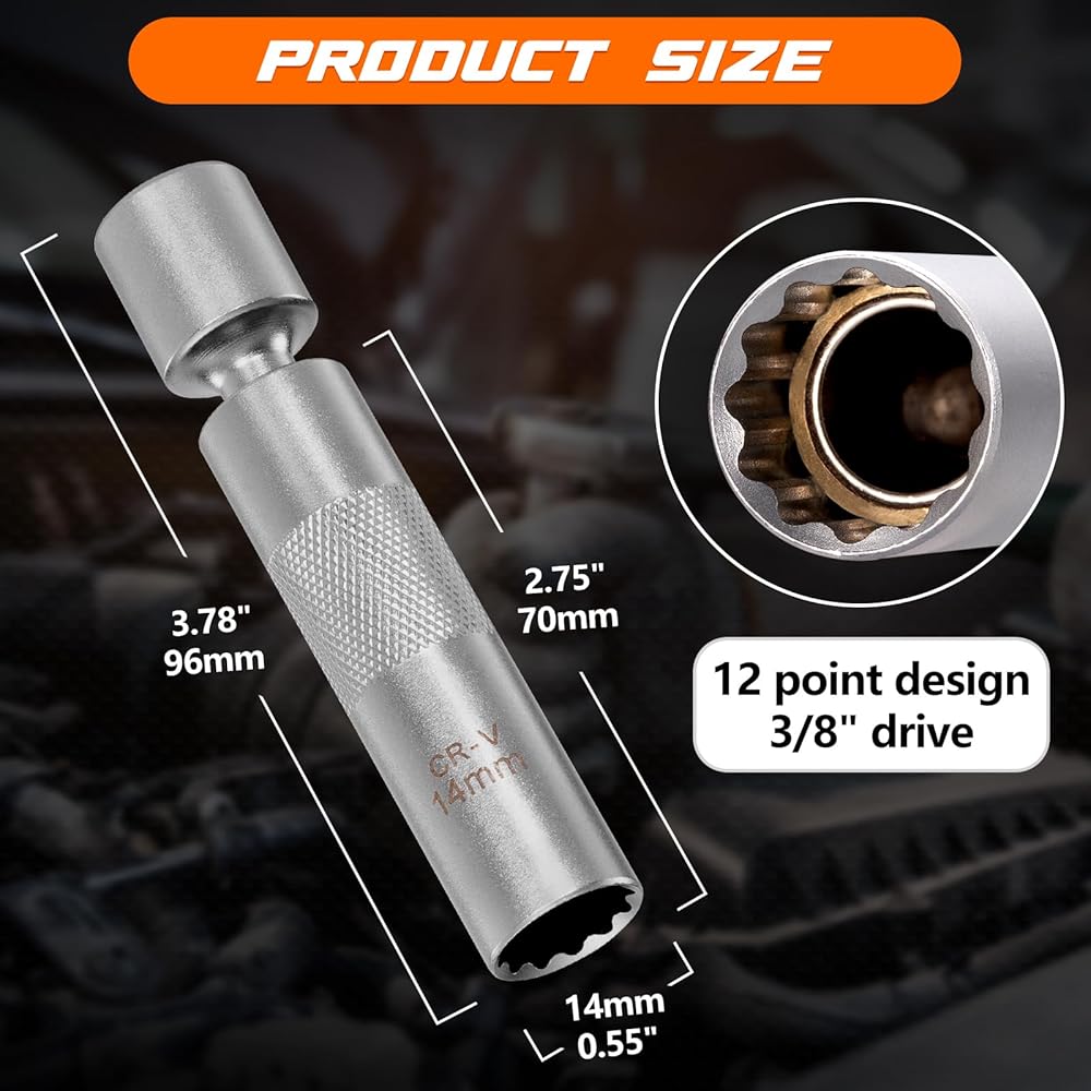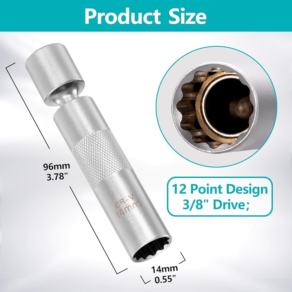 🔥 مصنوع من فولاذ الكروم الفاناديوم المتين عالي الجودة، مقبس قابس الإشعال مقاس 3/8 بوصة مقاس 14 مم متين ومقاوم للصدأ. تضمن الحركة الدوارة 360 درجة أقصى قدر من المرونة