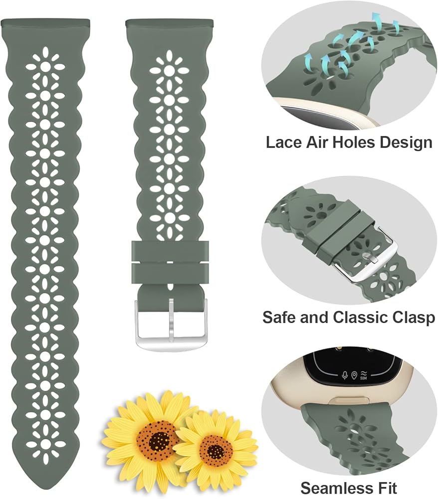 【مادة سيليكون ناعمة وملساء】أساور ساعة فيتبيت سينس للنساء مصنوعة من مادة السيليكون الناعمة الممتازة، ومصممة بفتحات تهوية من الدانتيل، مسامية ومريحة لمعصمك. سوار ساعة فيتبيت فيرسا 3 / فيرسا 4 باندز / فيتبيت سينس 2 ناعم، عديم الرائحة، متين، مقاوم للماء، مقاوم للأوساخ، خفيف الوزن وصديق للبشرة. يرجى شرائه بثقة!