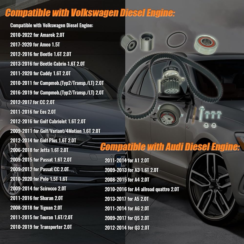 【متوافق مع مركبات أودي】: مجموعة حزام التوقيت مع مضخة مياه لـ 2011-2014 Audi A1 2.0T، 2009-2013 Audi A3 1.6T 2.0T، 2008-2015 Audi A4 2.0T، 2010-2016 Audi A4 allroad quattro 2.0T، 2013-2017 أودي A5 2.0T، 2011-2014 أودي A6 2.0T، 2012-2014 أودي Q3 2.0T، 2009-2017 أودي Q5 2.0T