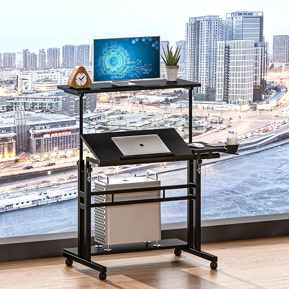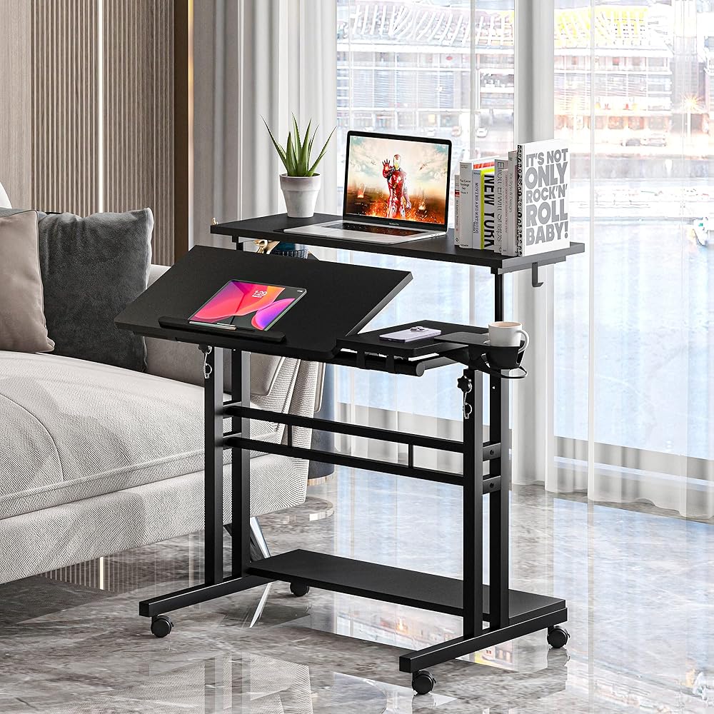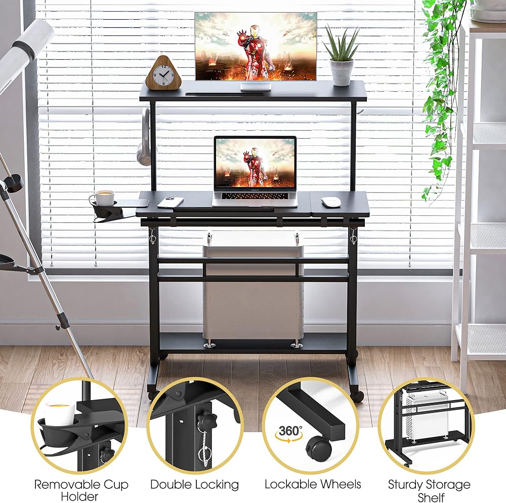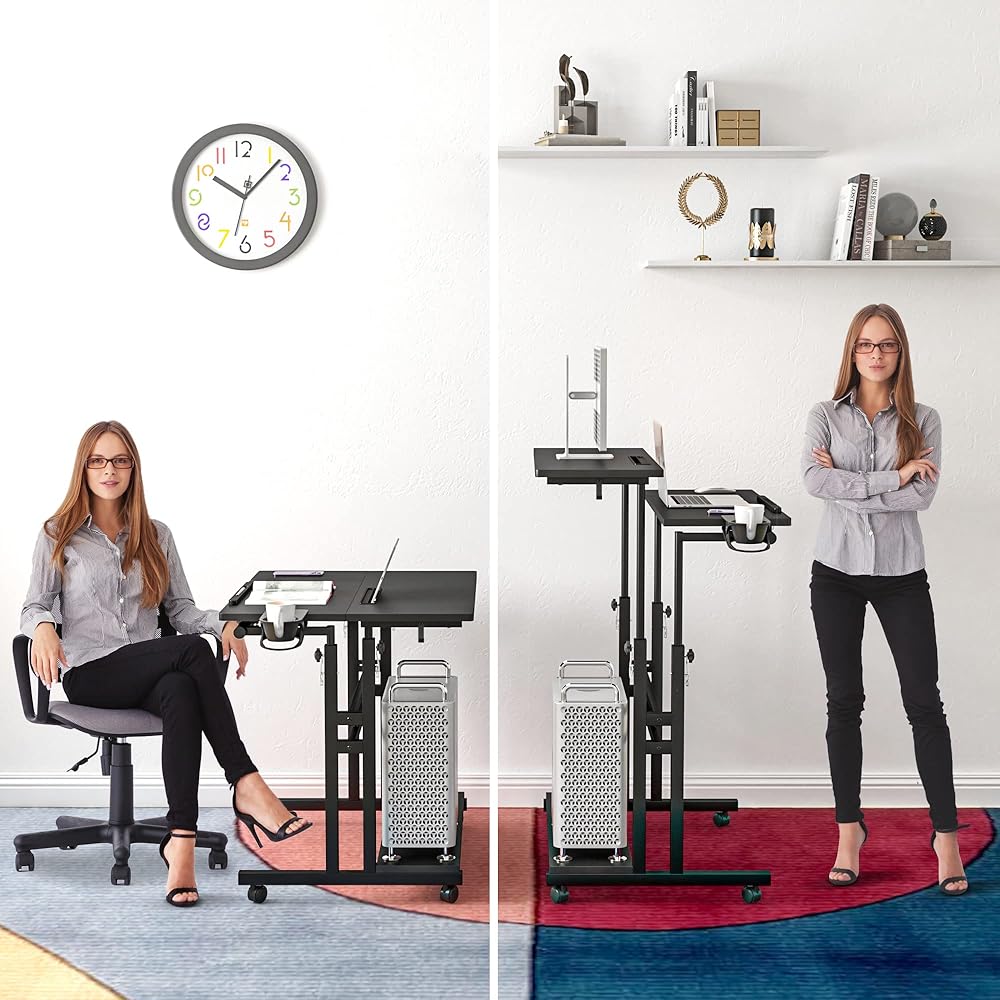 مكتب متنقل مع 3 أجهزة كمبيوتر مكتبية، مكتب قابل للتعديل بعجلات وحامل أكواب - مكتب كمبيوتر محمول مثالي للمكتب المنزلي ومكتب كمبيوتر محمول للمساحات الصغيرة