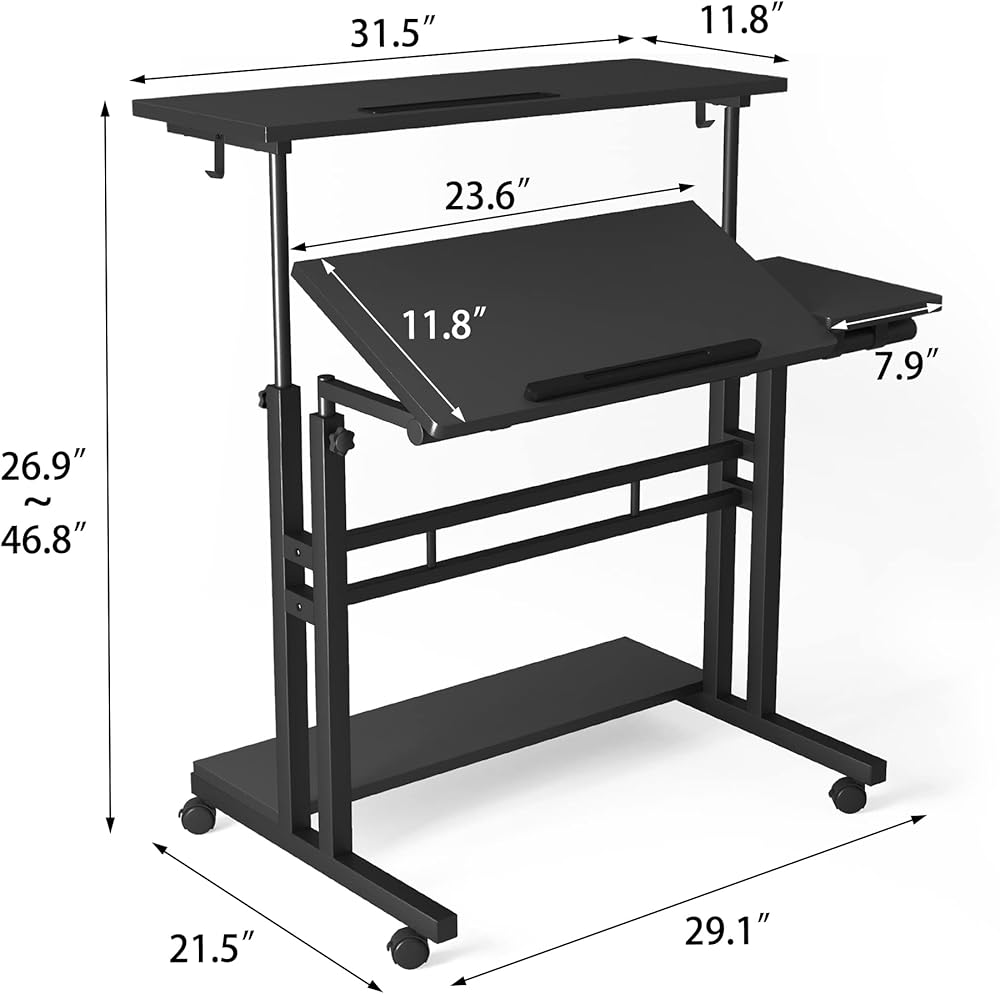 َ 𝗹𝘀: اضبط ارتفاع هذا المكتب المحمول حسب رغبتك من 26.9 بوصة إلى 46.8 بوصة مع زيادة الثبات باستخدام دبابيس المقبض التي تمنع الانزلاق. أربع عجلات قابلة للقفل تسمح بسهولة النقل، كما أن الارتفاع حوالي 4 بوصات بين العجلة والقاعدة السفلية يسمح لها بالانزلاق تحت الأريكة.
