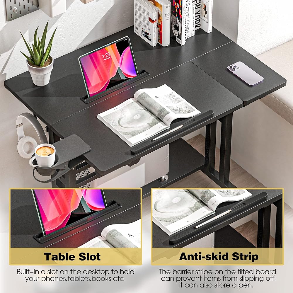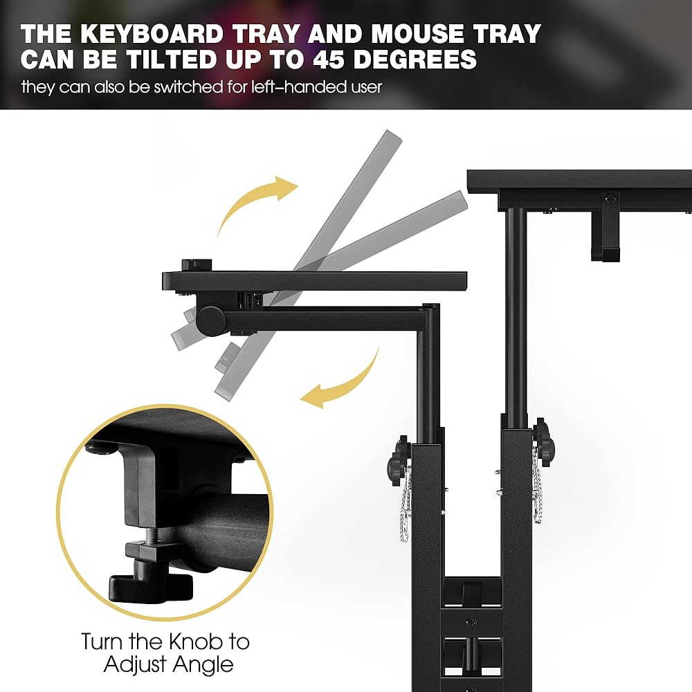 𝗦𝗺𝗮𝗹𝗹 𝗦𝘁𝗮𝗻𝗱𝗶𝗻𝗴 𝗗𝗲𝘀𝗸 𝘄𝗶𝘁𝗵 𝗖𝘂𝘀𝘁𝗼𝗺𝗶𝘇 𝗮𝗯𝗶𝗹𝗶𝘁𝘆: ثلاثة أقسام منفصلة تسمح لك بضبط ارتفاع منصة الكمبيوتر ودرج لوحة المفاتيح ودرج الماوس بشكل مستقل للحصول على مساحة عمل مخصصة. تميل أدراج لوحة المفاتيح والماوس حتى 45 درجة، مما يلبي احتياجات كل من مستخدمي اليد اليسرى واليمنى.