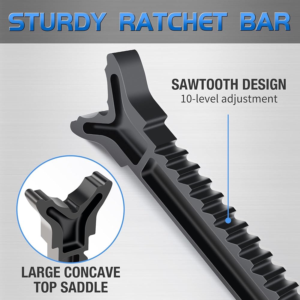 [قضيب سقاطة قوي]: مصنوع من حديد مطاوع عالي الجودة، يتميز قضيب السقاطة متعدد المواضع بتصميم سن المنشار، مما يسمح بتعديل الارتفاع السريع الذي يتم تثبيته في مكانه. سرجها العلوي المقعر الكبير يدعم الحمولة بقوة للحفاظ على السلامة
