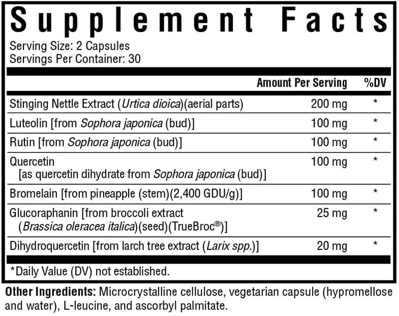 الدعم الموسمي: يحتوي على مزيج فريد من مركبات الفلافونويد الطبيعية والبروميلين ومستخلصات نبات القراص اللاذع والبروكلي التي قد تعمل معًا لتوفير الدعم الموسمي، بالإضافة إلى دعم عدم تحمل الهيستامين.