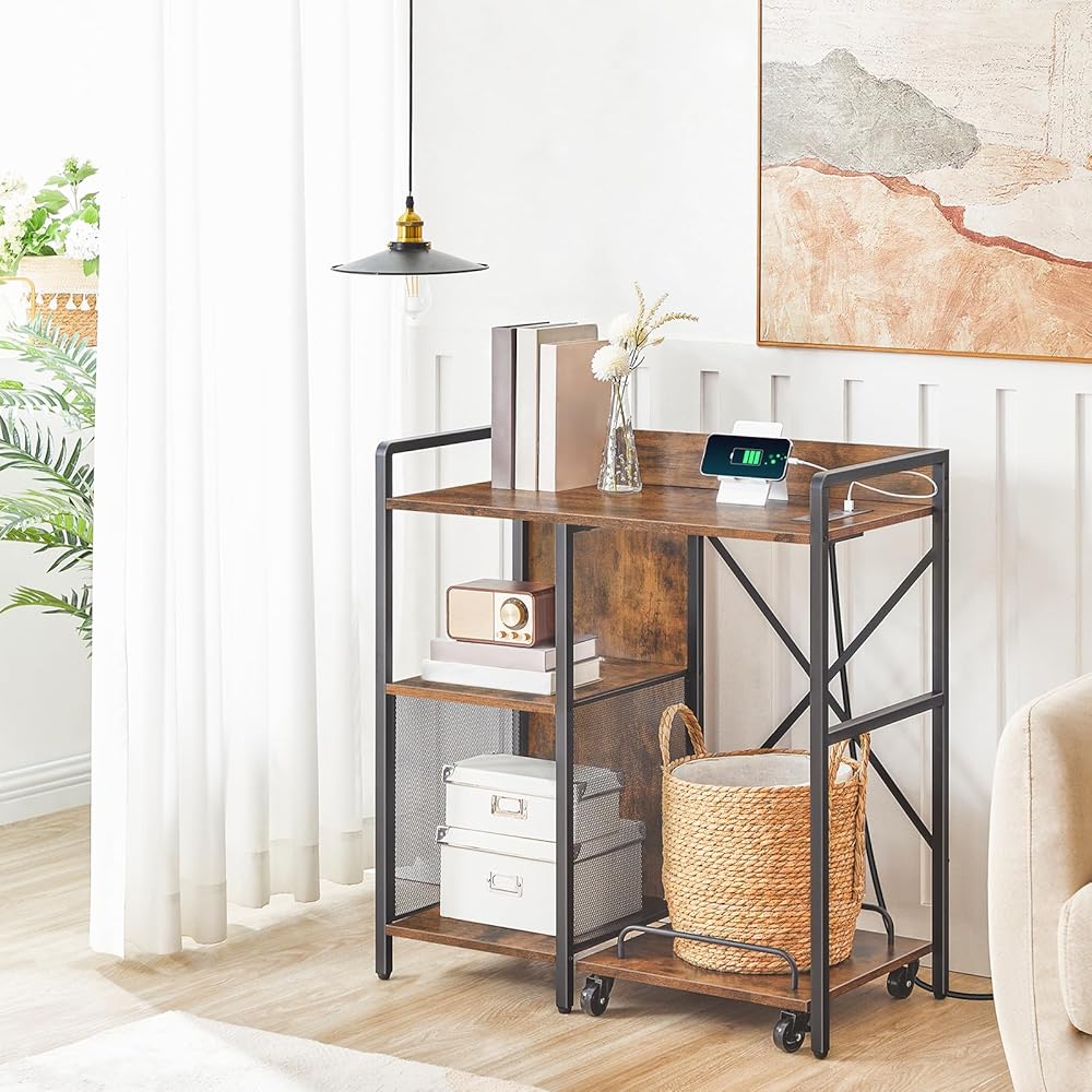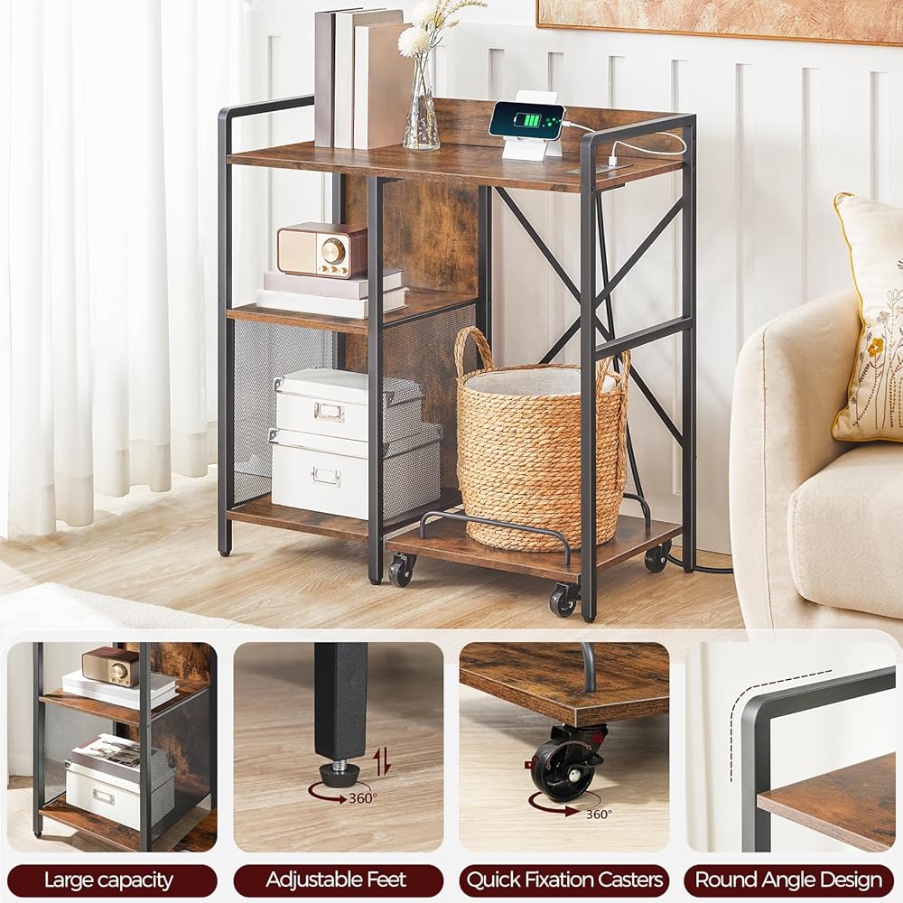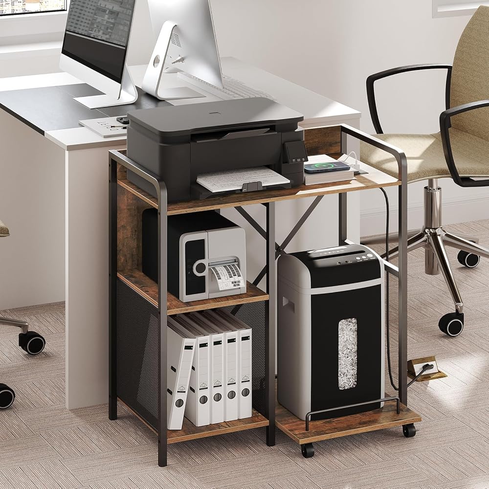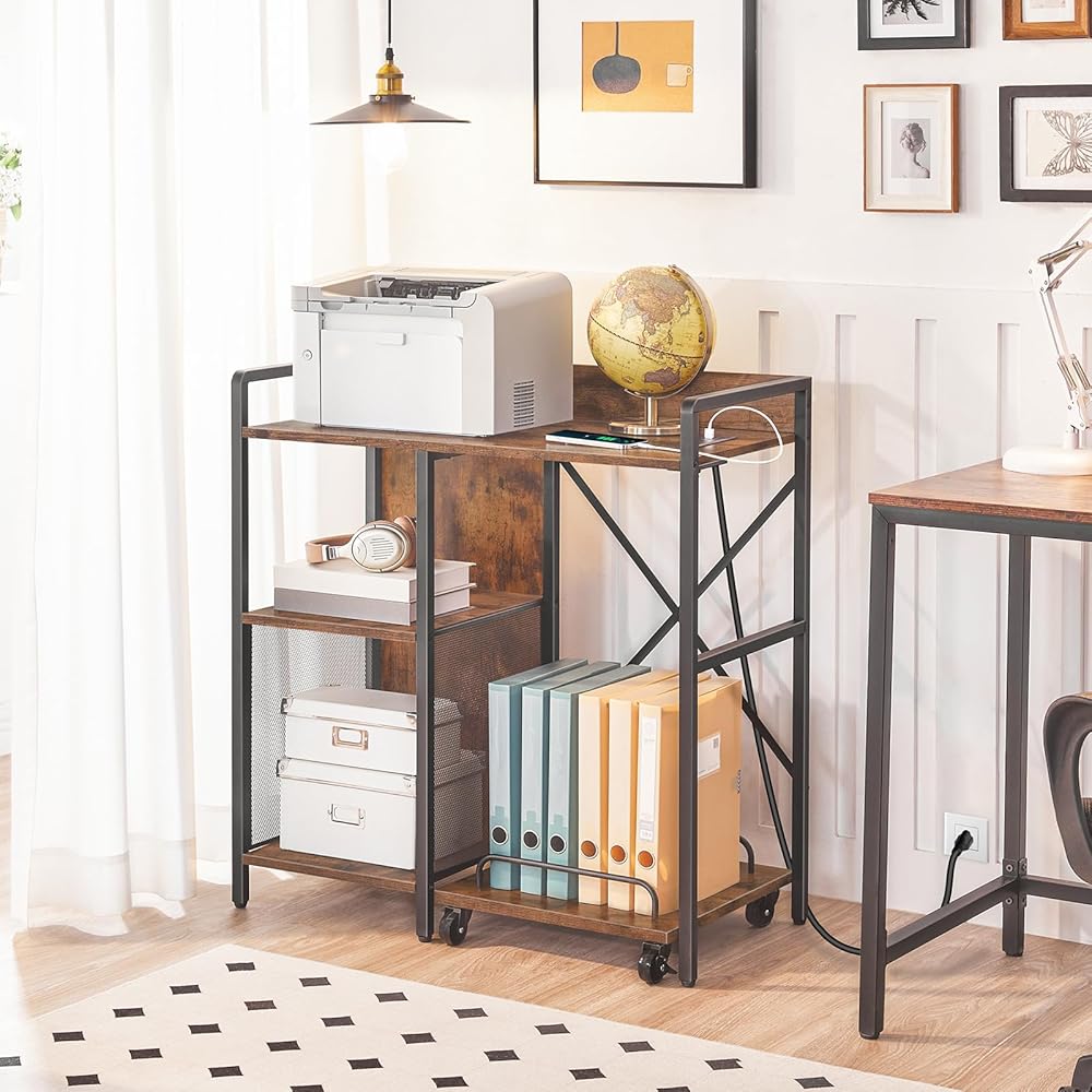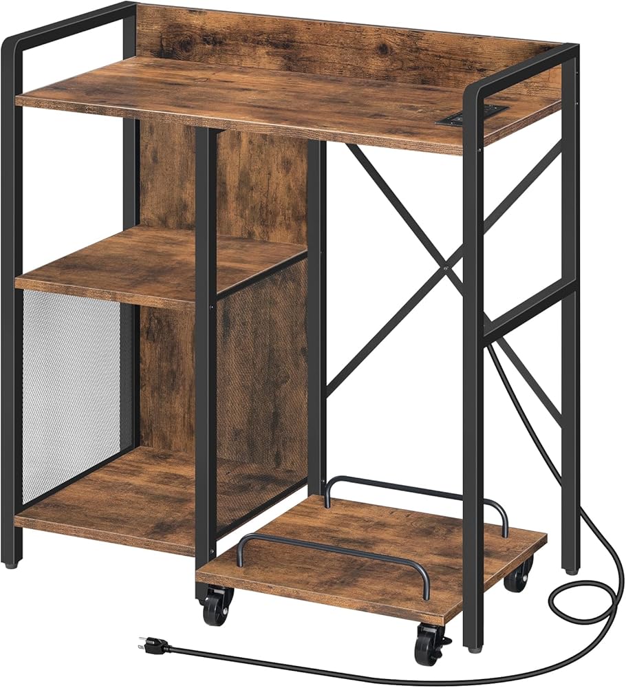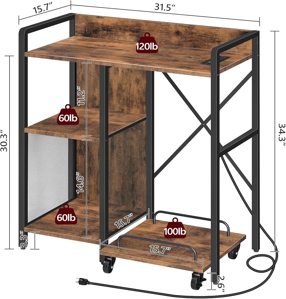 حامل الطابعة مع مساحة تخزين، طاولة الطابعة مع حامل تقطيع الورق، رف الطابعة مع مقبس ومنفذ شحن USB، حامل وحدة المعالجة المركزية، عربة طابعة دوارة للمكتب المنزلي، بني ريفي PTHR80E01