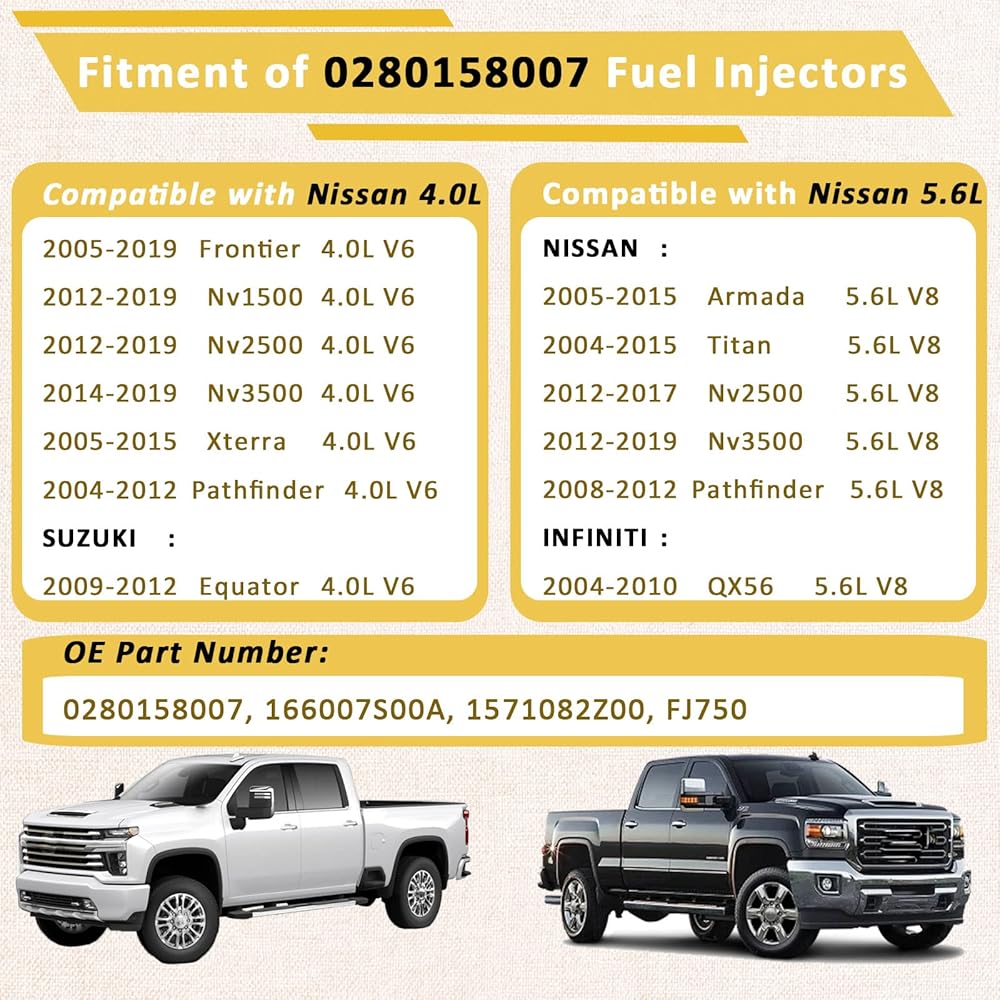【الإعداد】محاقن الوقود الأصلية 166007S00A، يرجى استخدام "ملاءمة أمازون المؤكدة" أعلاه للتحقق من الملاءمة قبل الشراء. متوافق مع/Nissan 5.6L Pathfinder Armada Titan 2005-2015، متوافق مع/Nissan 4.0L Frontier Xterra NV1500 NV2500 2004-2012، متوافق مع/إنفينيتي 4.0 لتر Qx56 2004-2010،|12 فتحة| |مجموعة من 8|.