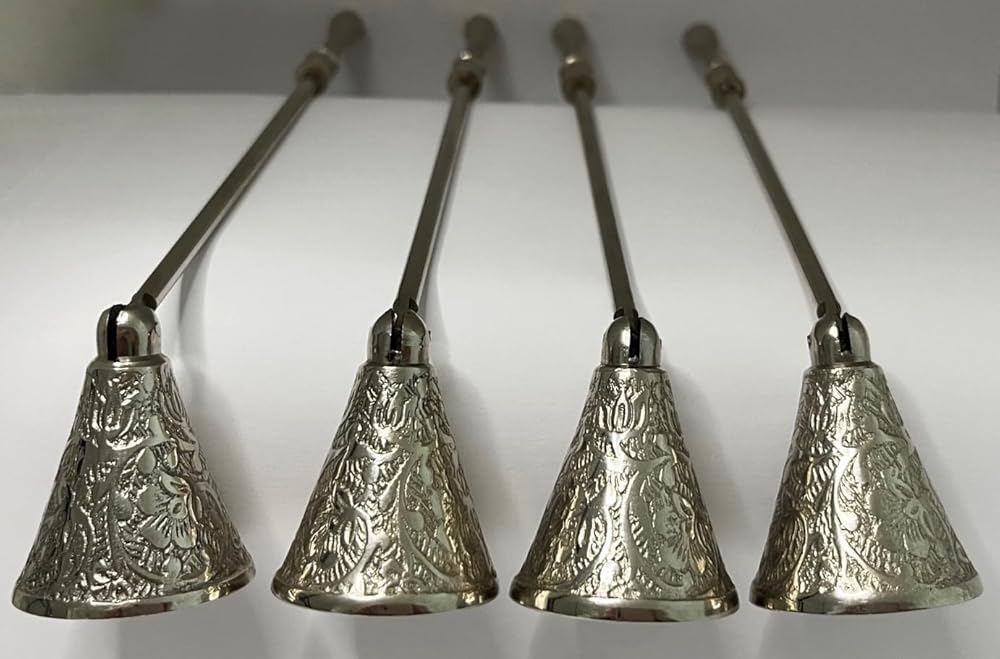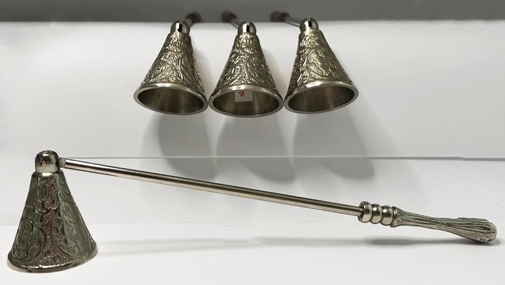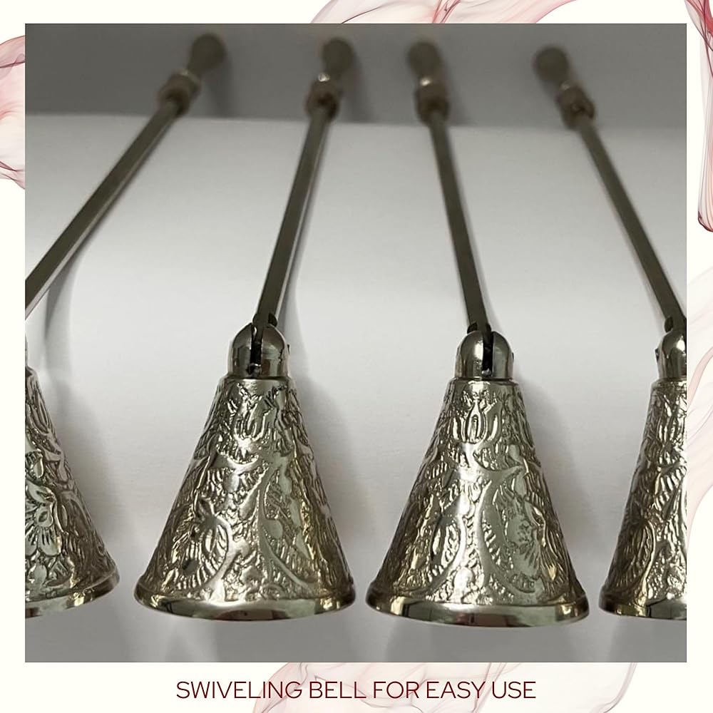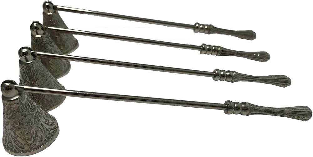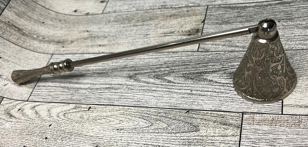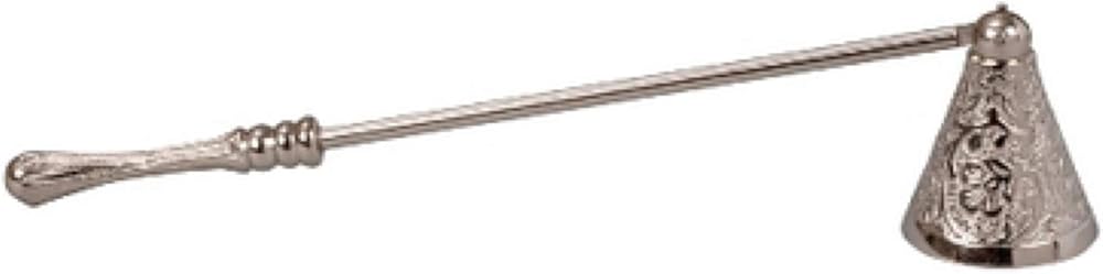 POLISHED NICKEL: Classic bell snuffer with beautifully carved details on the bell and handle; swivels to accommodate candles of various heights