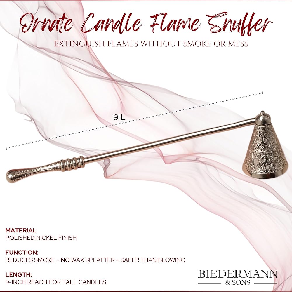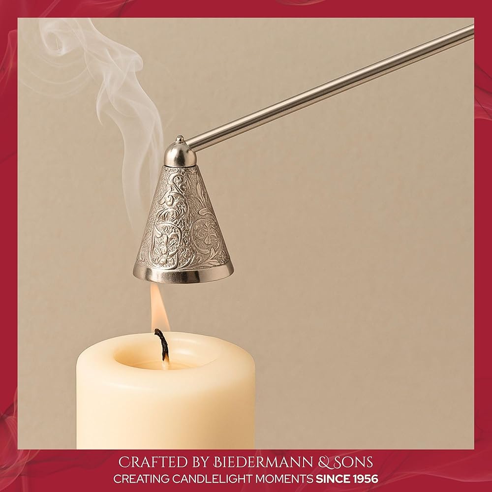 Elegantly and safely extinguish your candles with this ornate nickel candle snuffer. Measuring 9-inches long and approximately 2-inches high it can be used on any pillar, taper, votive or tealight candle. Easy to use- be sure to hold the snuffer just above the flame for minimal smoke and to prevent wax build up inside. The ideal gift for any candle lover for any occasion. Be sure to look for additional styles and items from Biedermann & Sons. Biedermann & Sons has been designing, producing and importing distinctive candles and giftware since 1956. From exclusive Christmas ornaments highly valued by collectors, to your basic candle needs, you're sure to find what you need in decor, candles and candleholders at Biedermann.