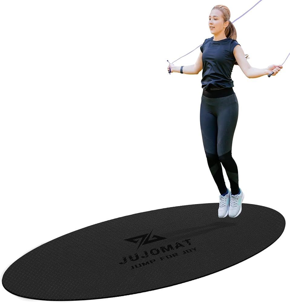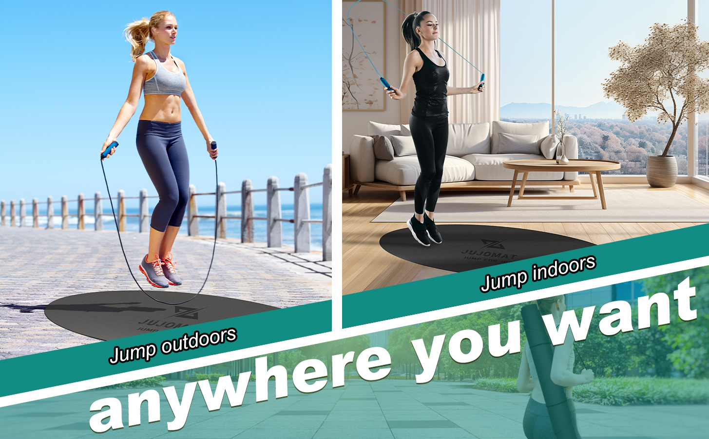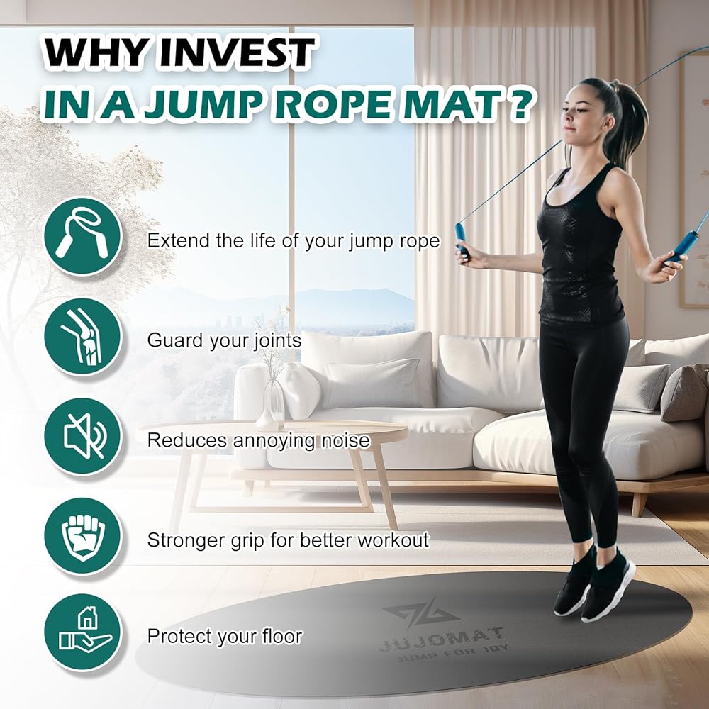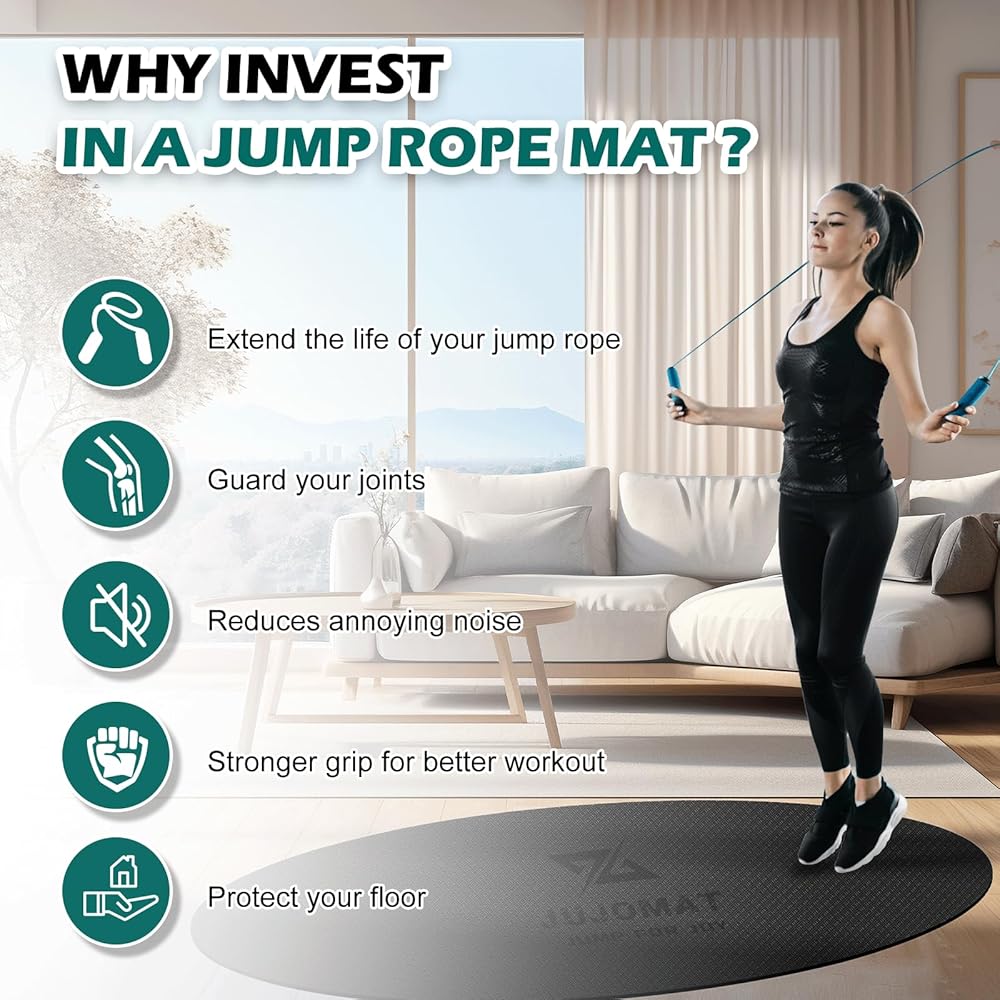 حماية الأرضية وحفظ حبل القفز: بساط القفز JUJOMAT لا يحمي أرضياتك فقط؛ فهو يضمن عدم تعرض حبال القفز للتلف بسبب الخرسانة أو الأسطح الصلبة الأخرى، مما يوفر لك المال على المدى الطويل.