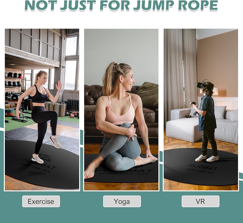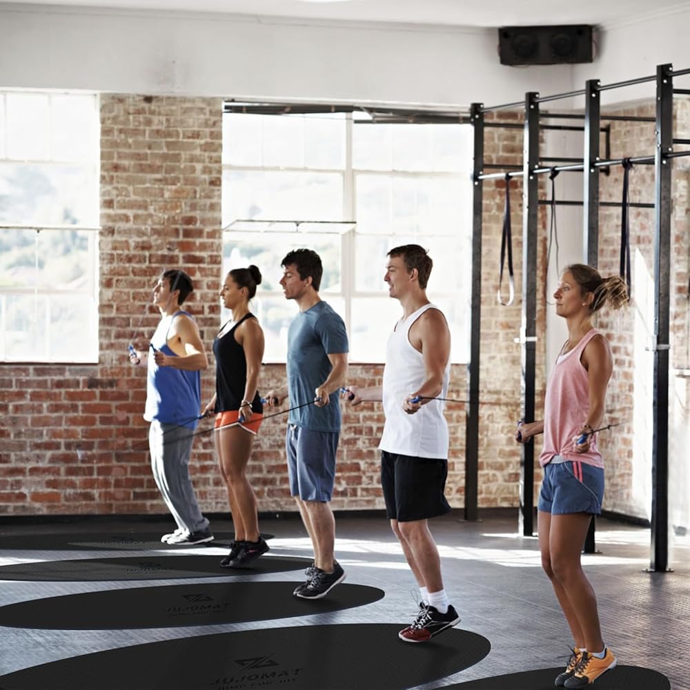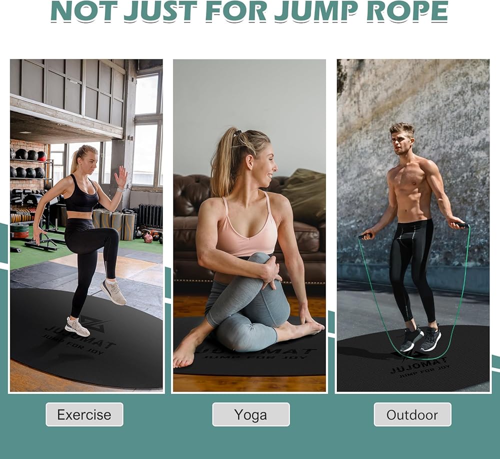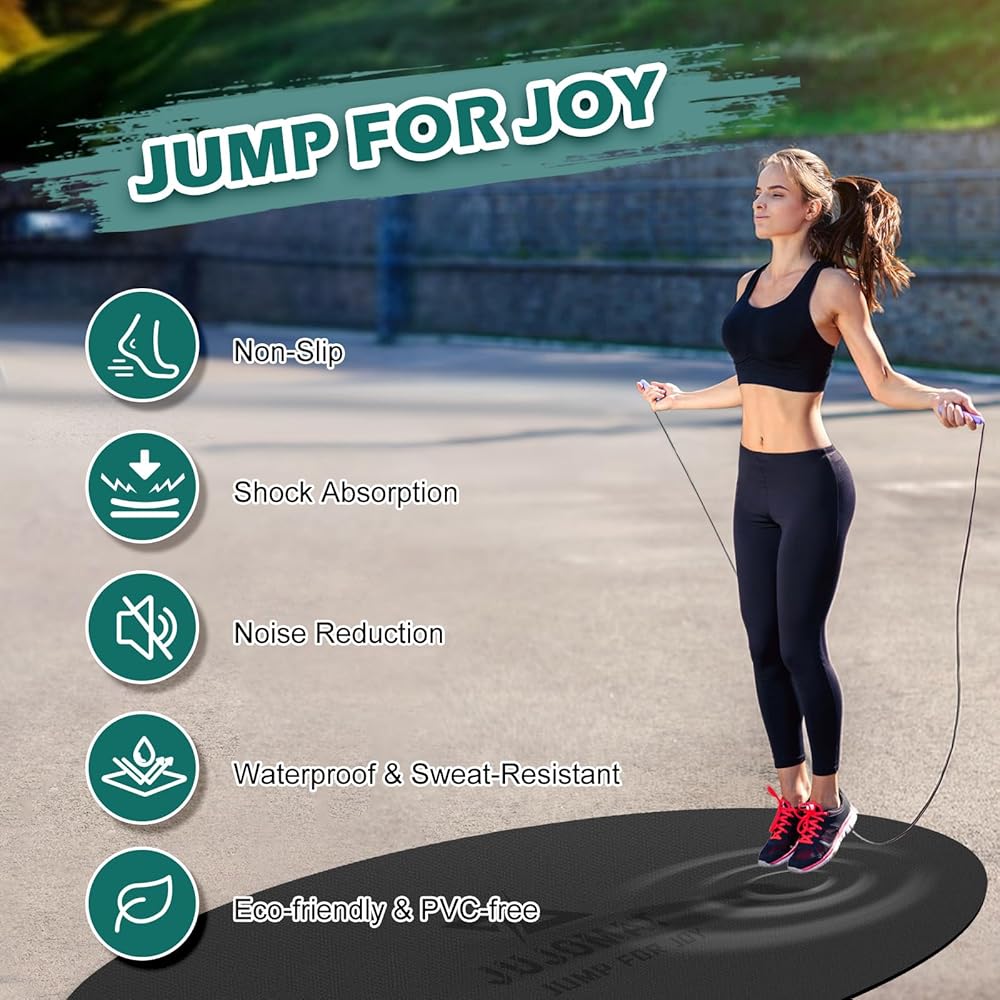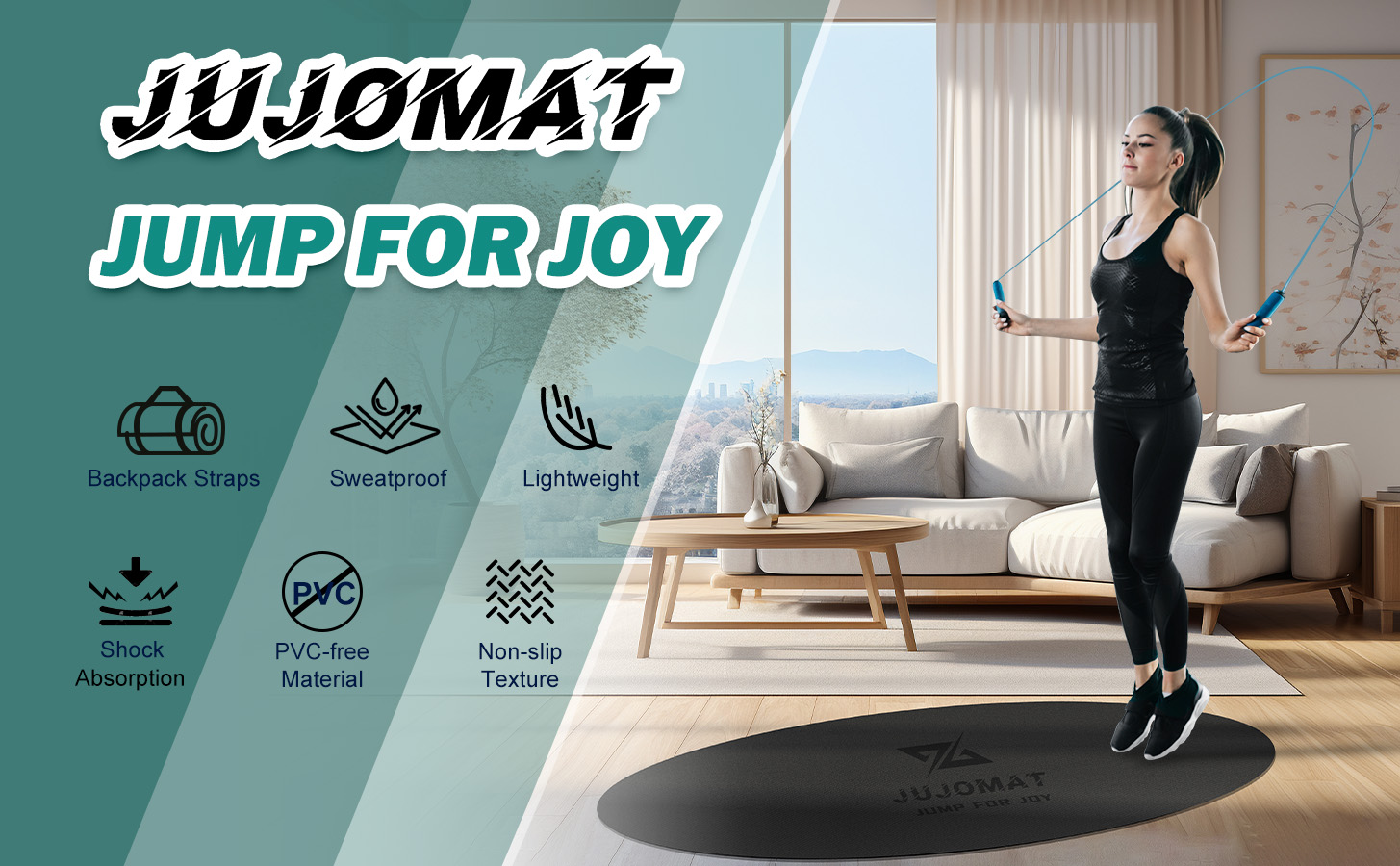 حماية الأرضية وحفظ حبل القفز: بساط القفز JUJOMAT لا يحمي أرضياتك فقط؛ فهو يضمن عدم تعرض حبال القفز للتلف بسبب الخرسانة أو الأسطح الصلبة الأخرى، مما يوفر لك المال على المدى الطويل.