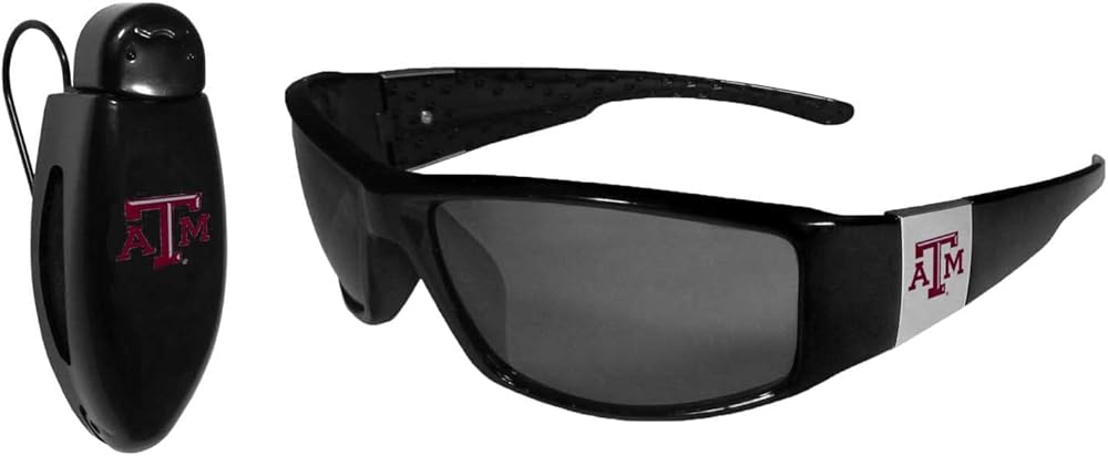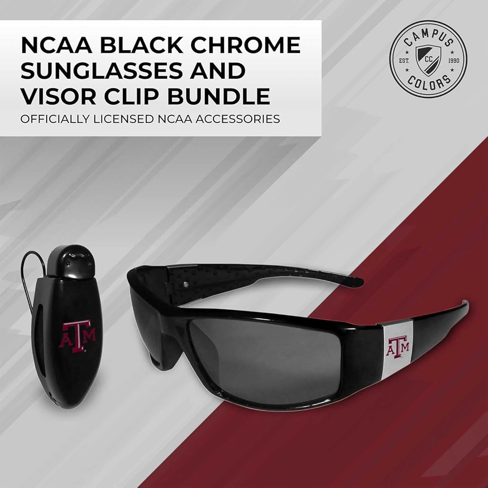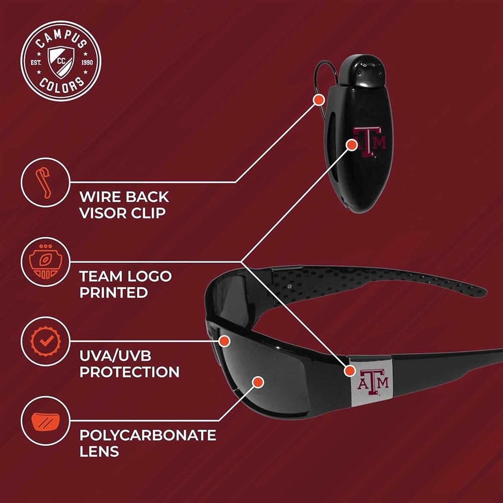 Officially licensed bundle; this college sunglasses bundle comes with black Texas A&M Aggies sunglasses and a black visor clip for your car, backpack, or purse; the Texas A&M Aggies sunglass holder makes a cool car accessory for any fan, college student, or university alumn