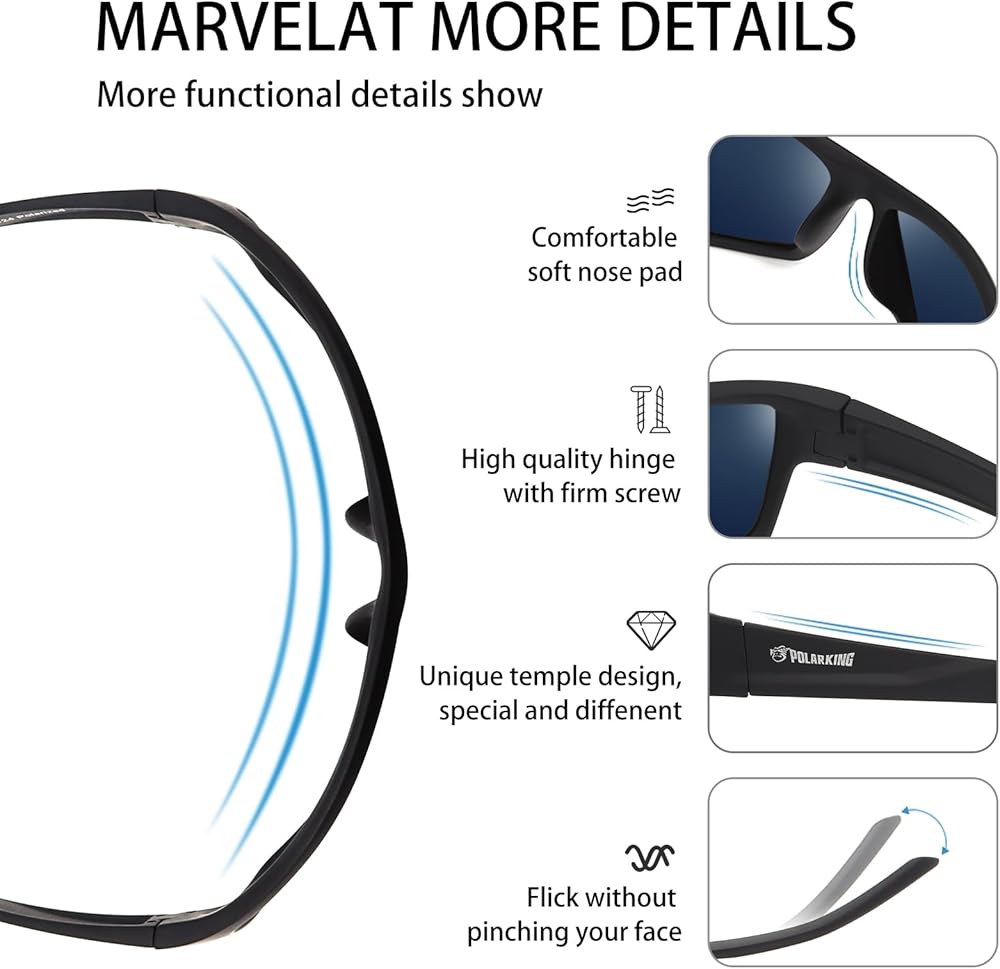 5.Lightweight PC Frame Lightweight PC Frame makes you barely feel the weight of sunglasses when wear to do any sports like driving,cycling,climbing, fishing and so on.