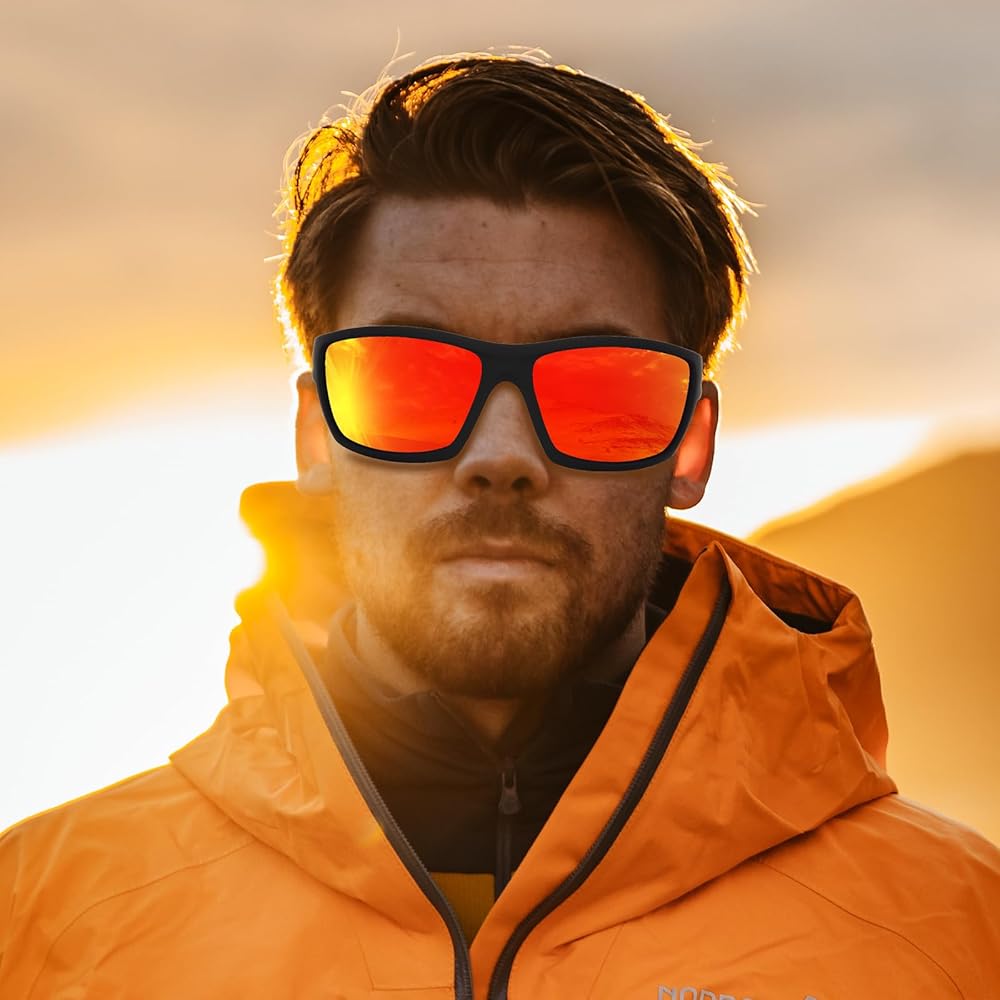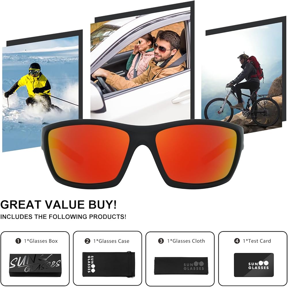 • CLASSIC SPORTS SQUARE SUNGLASSES:Taking inspiration from the retro square sunglasses for men blueprint, we created this upgraded men's sunglasses with sporty wrap-around design style. Bold curved frame make wearer look cooler no matter what clothes you match. With a pair of classic square shades can fit you perfectly and make you outstanding in the crowd.