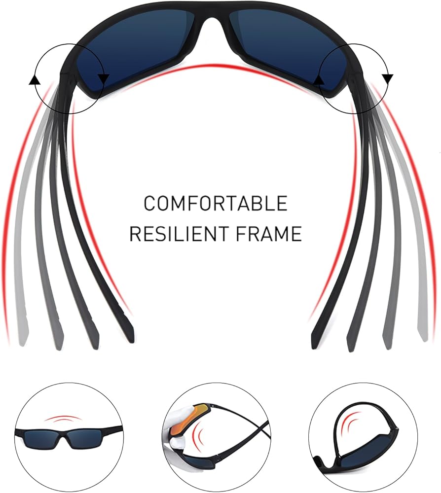 • TPEE FRAME SHADY RAYS TECHNOLOGY:Sunglass frames are lightweight, extremely flexible,and heat and UV resistant.Durability and lightweight TPEE frame with nose pad and temple increase grip with perspiration to offering all day comfortable fit.Adjust to the size you like, without distortion and suitable for medium to large faces.Ergonomic design fits many face shapes comfortably and all sporty event.