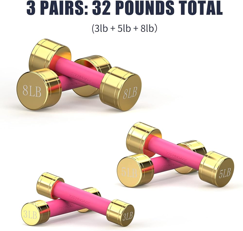 مجموعة الدمبل متعددة الأوزان: تشتمل مجموعات الدمبل على أزواج من الدمبل ذات الأوزان الدقيقة 3 رطل و5 رطل و8 رطل، بالإضافة إلى رف تخزين. تتوفر هذه المجموعات باللون الأسود والوردي والأزرق والوردي، وهي مثالية لتدريبات المقاومة والتدريبات المختلفة
