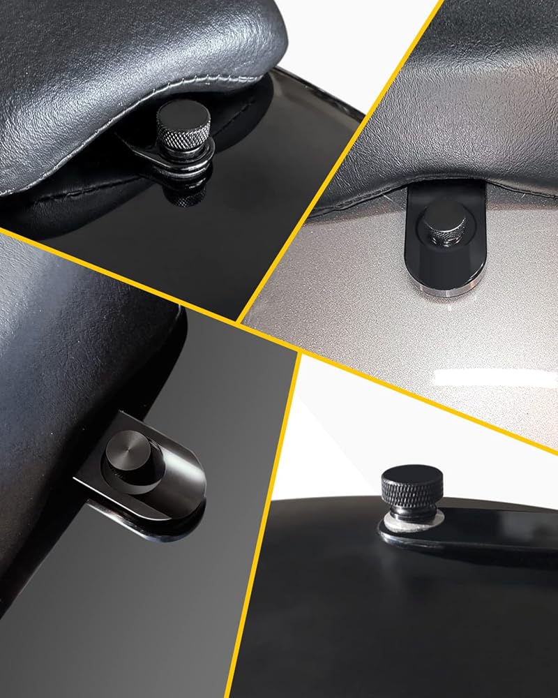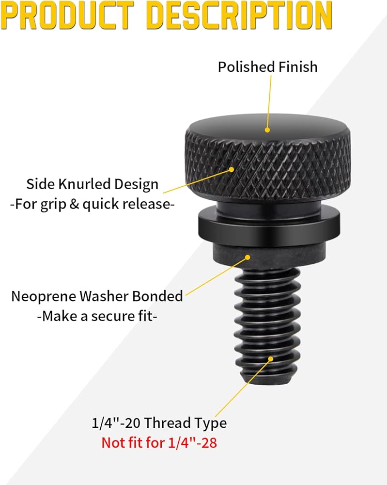 • نوع الخيط: إنه 1/4"-20 خيط، يمكن أن يحل محل مسمار المقعد القياسي. يرجى التحقق من نوع الخيط الموجود على مسمار المقعد الخاص بك للتأكد من أن العناصر ستكون متوافقة مع دراجتك النارية. لا تناسب 1/4"-28 نوع موضوع.