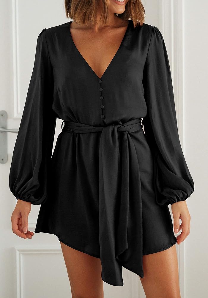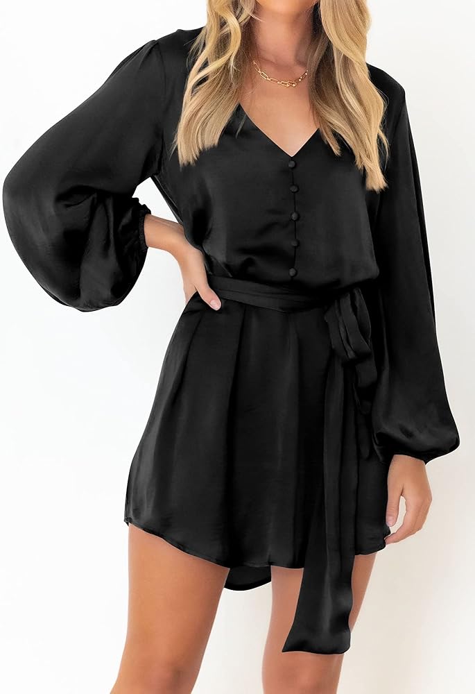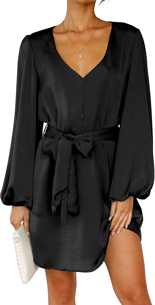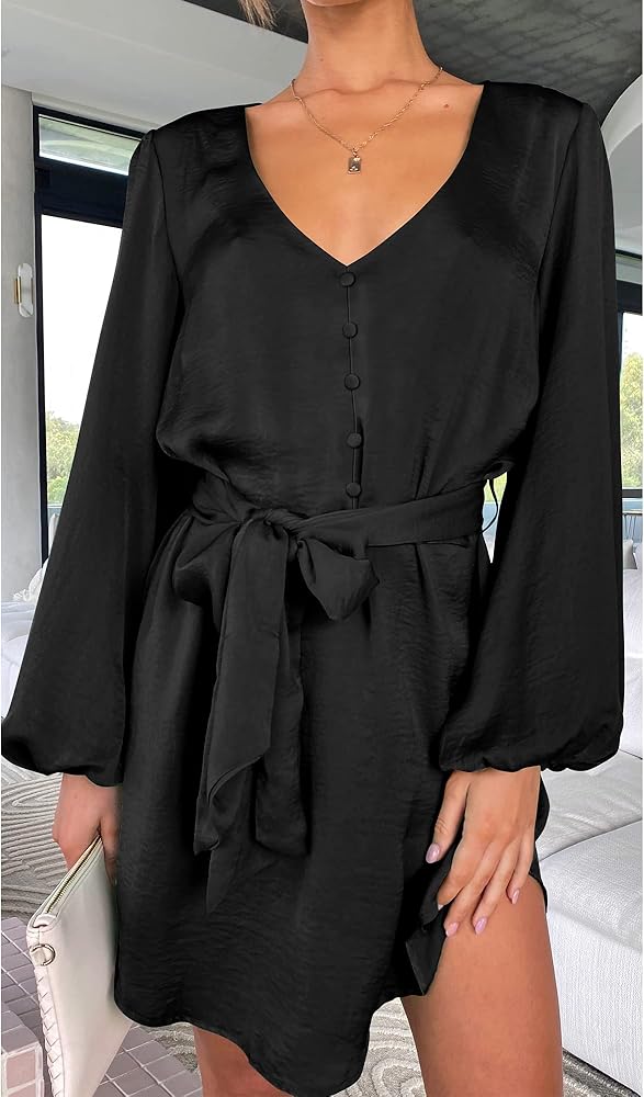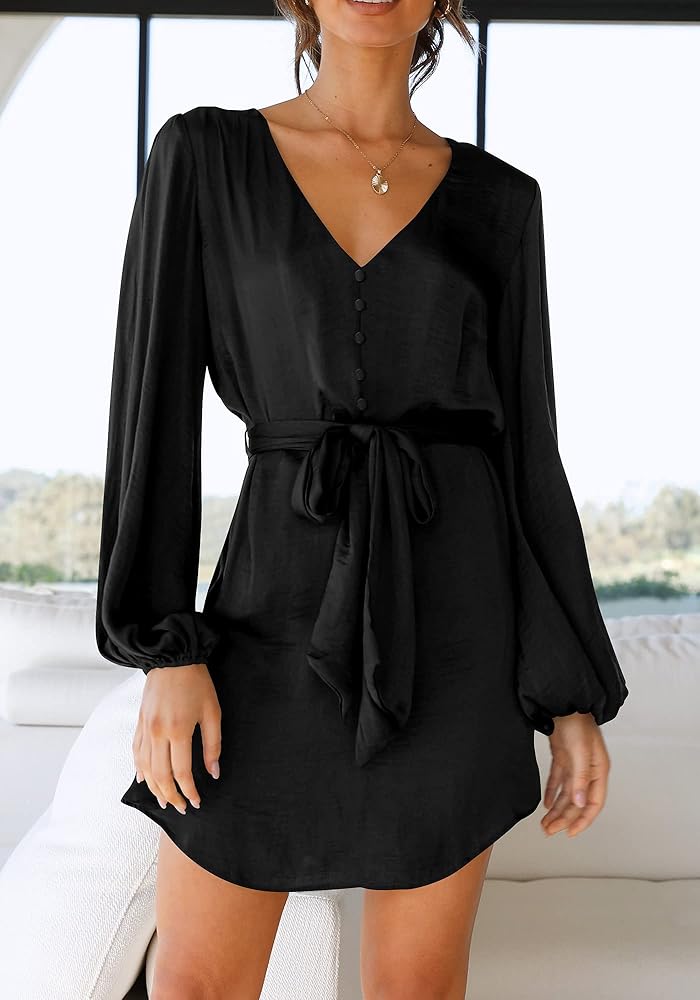 فستان ستان انسيابي للنساء! فستان طويل الأكمام منتفخ مثالي للخريف، ويحمي ذراعيك من البرد. تظهر الفساتين ذات الرقبة على شكل V عظمة الترقوة المثيرة لديك مع الحفاظ على الأناقة والجاذبية. يضيف الزر المزخرف الأمامي لمسة من الجاذبية والأناقة. فستان قصير فوق الركبة يبرز ساقيك الطويلة. بمجرد ارتداء هذا الفستان، ستكونين الأكثر لمعانًا بين الجميع سواء كنت في حفلة كوكتيل، أو حفل زفاف، أو رقصة العودة للوطن، أو النادي، أو الشاطئ