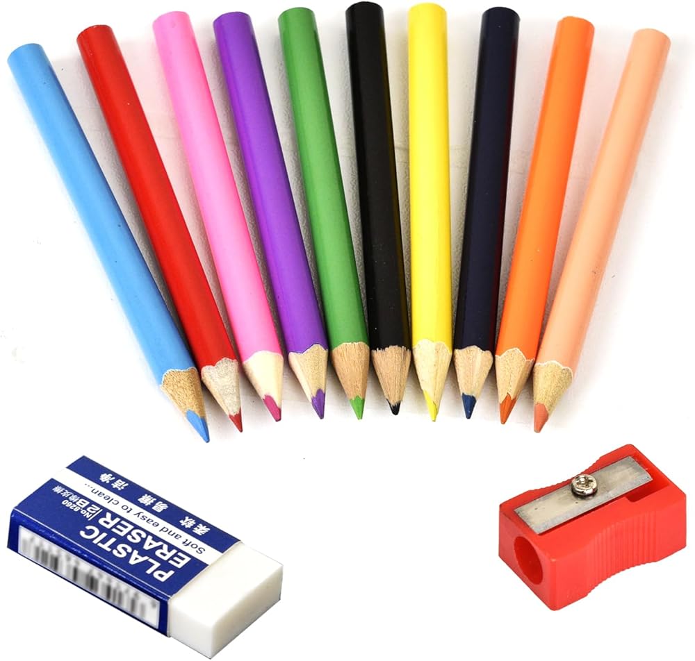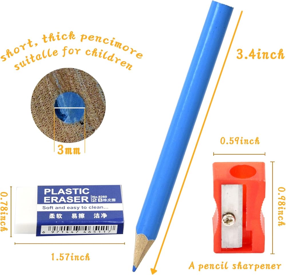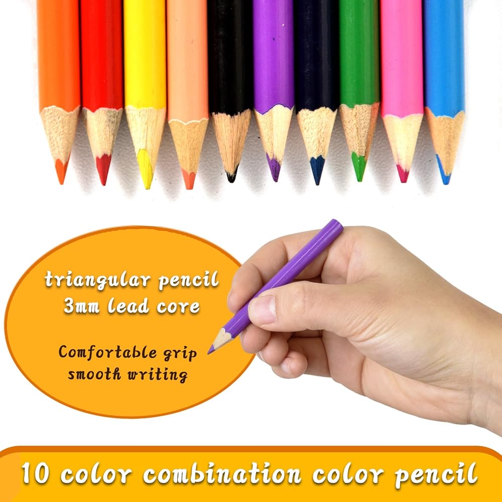 Short pencils suitable for beginners: These children's colored pencils are designed specifically for small hands, with appropriate stem length and thickness. They are 3.5 inches long (half the length of an adult pencil), come in 10 colors, and come with a pencil sharpener and eraser