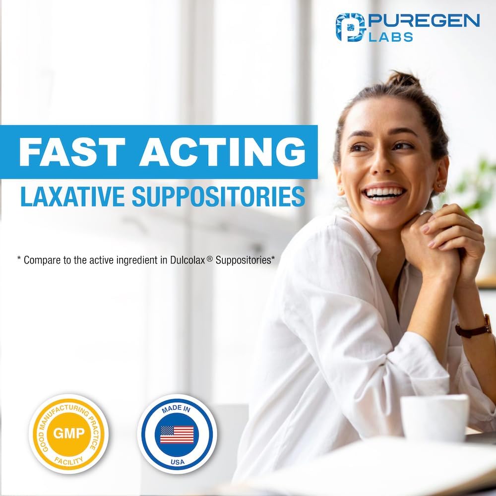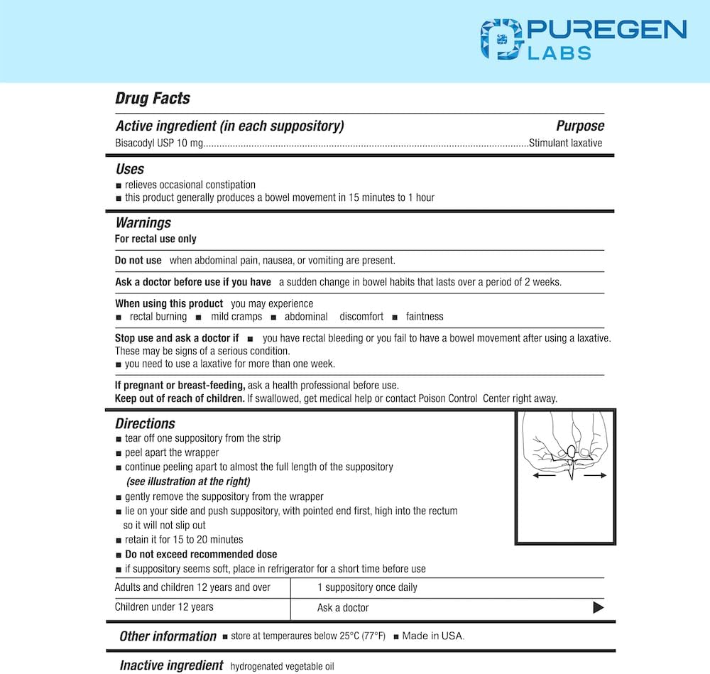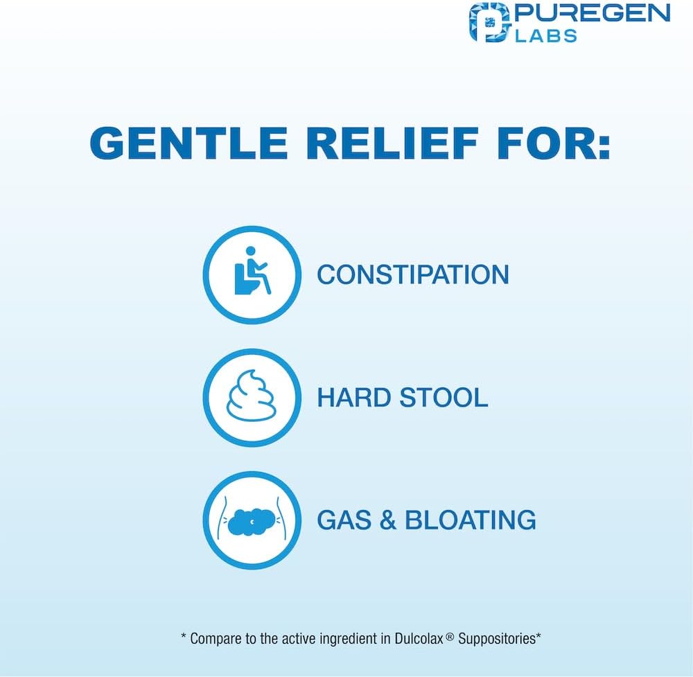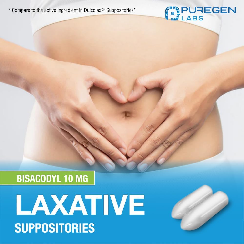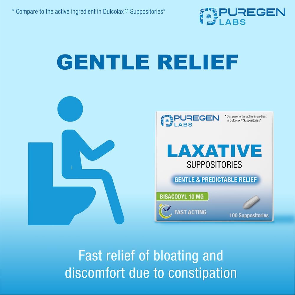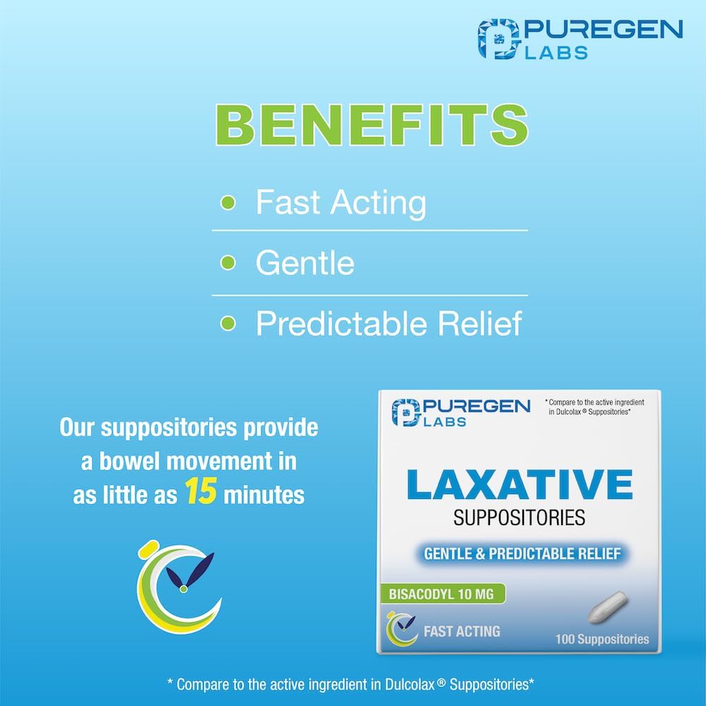 التحاميل الملينة سريعة المفعول من Puregen Labs، بيساكوديل USP، 10 ملجم - 100 قطعة | ملين منشط | تخفيف الإمساك | يعمل خلال 15 دقيقة إلى ساعة واحدة | تحميلة ملينة | صنع فى أمريكا